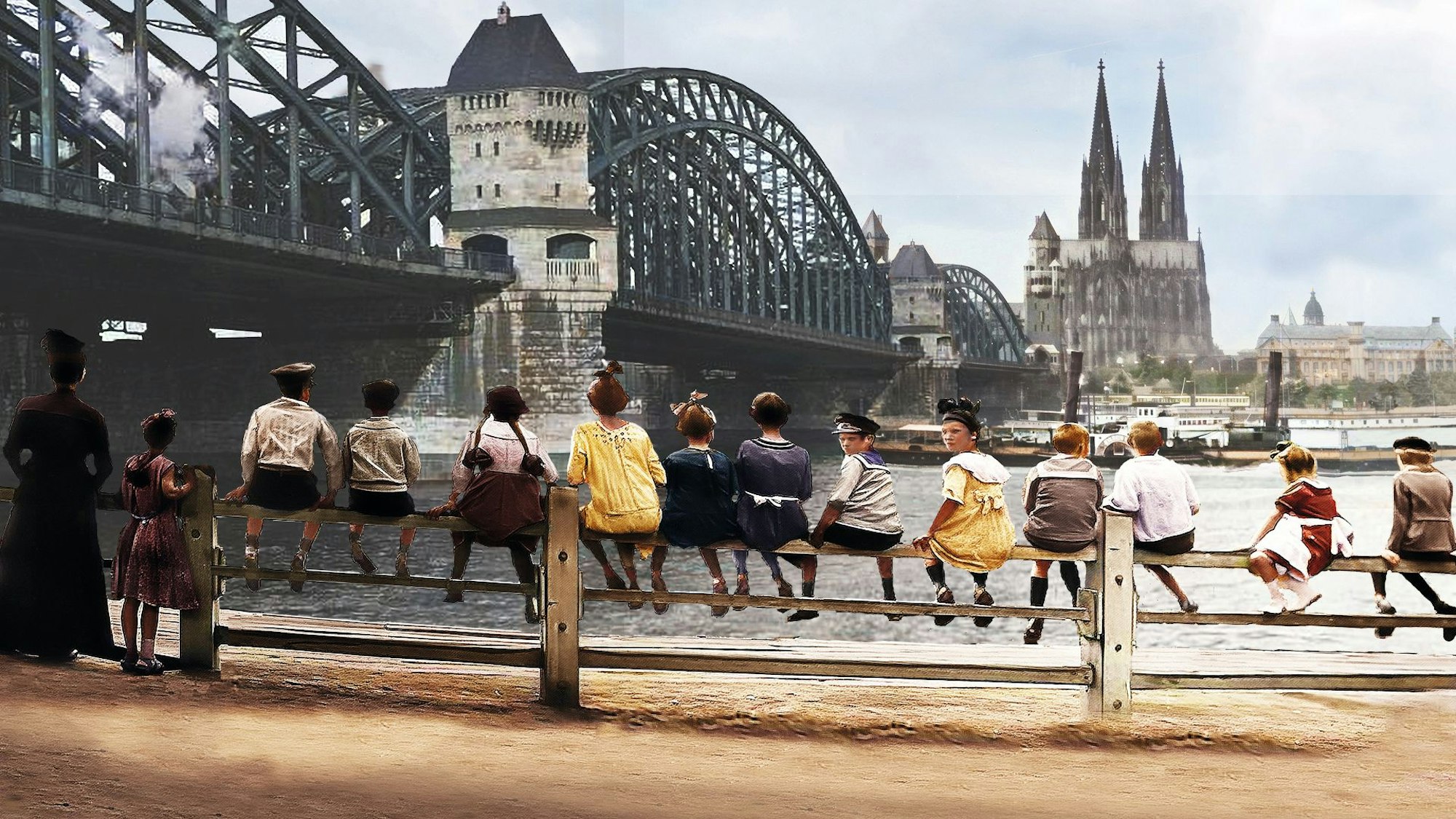 Zum Einstieg fährt eine Dampflok über die Hohenzollernbrücke in den Hauptbahnhof ein, auf dem Bahnsteig viele Leute mit Hut. „Stellt euch vor, ihr seid gerade in Köln angekommen, aber nicht heute, sondern in der Vergangenheit“, sagt die Sprecherin. In einer Zeit, in der Handys und E-Roller längst nicht erfunden sind, dafür allmählich das Auto und die elektrische Straßenbahn den Alltag beschleunigen. Willkommen im Köln der Zeit vor dem Zweiten Weltkrieg.