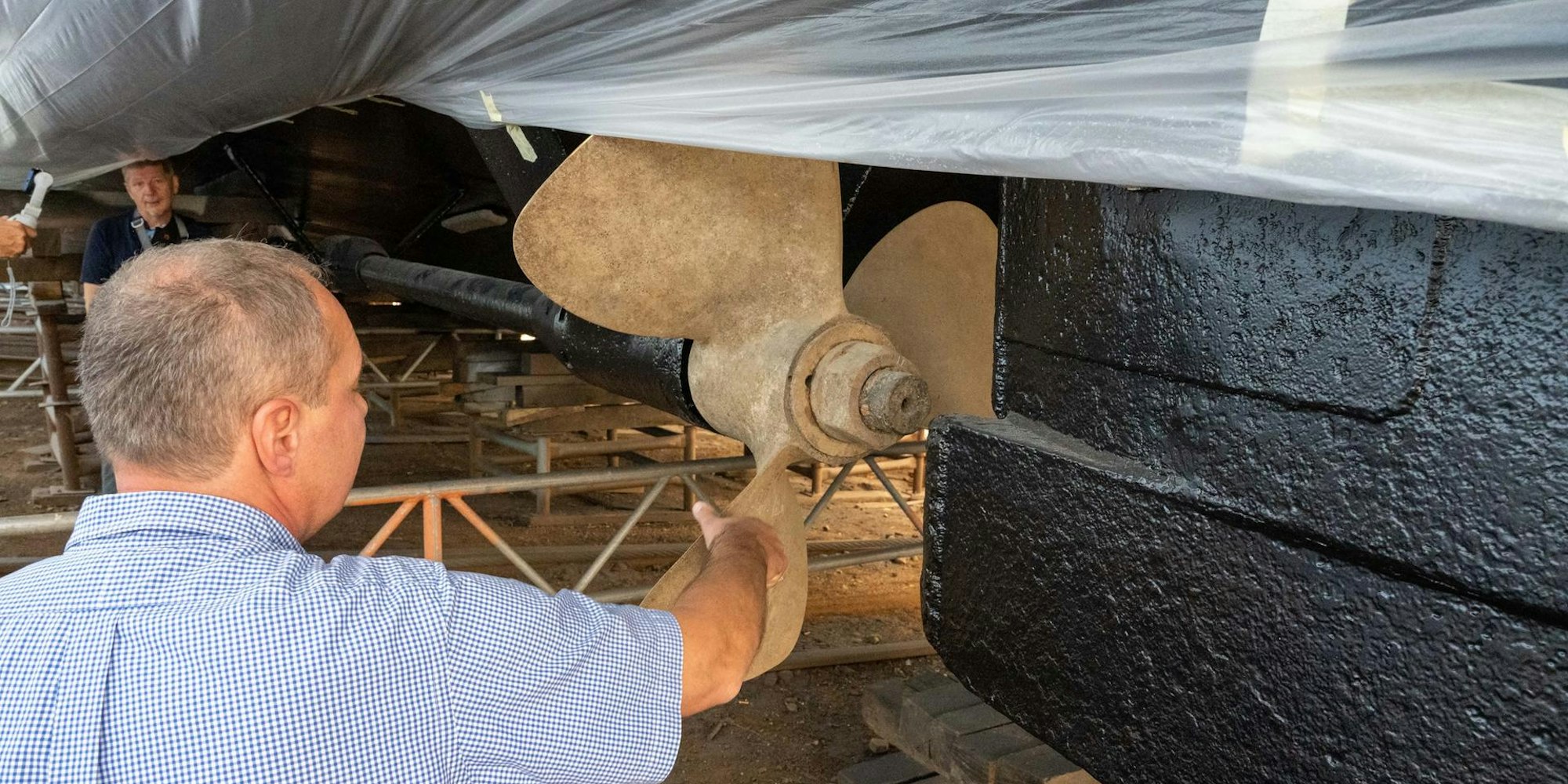Fachleute erklären die Arbeiten am Schiffsrumpf.