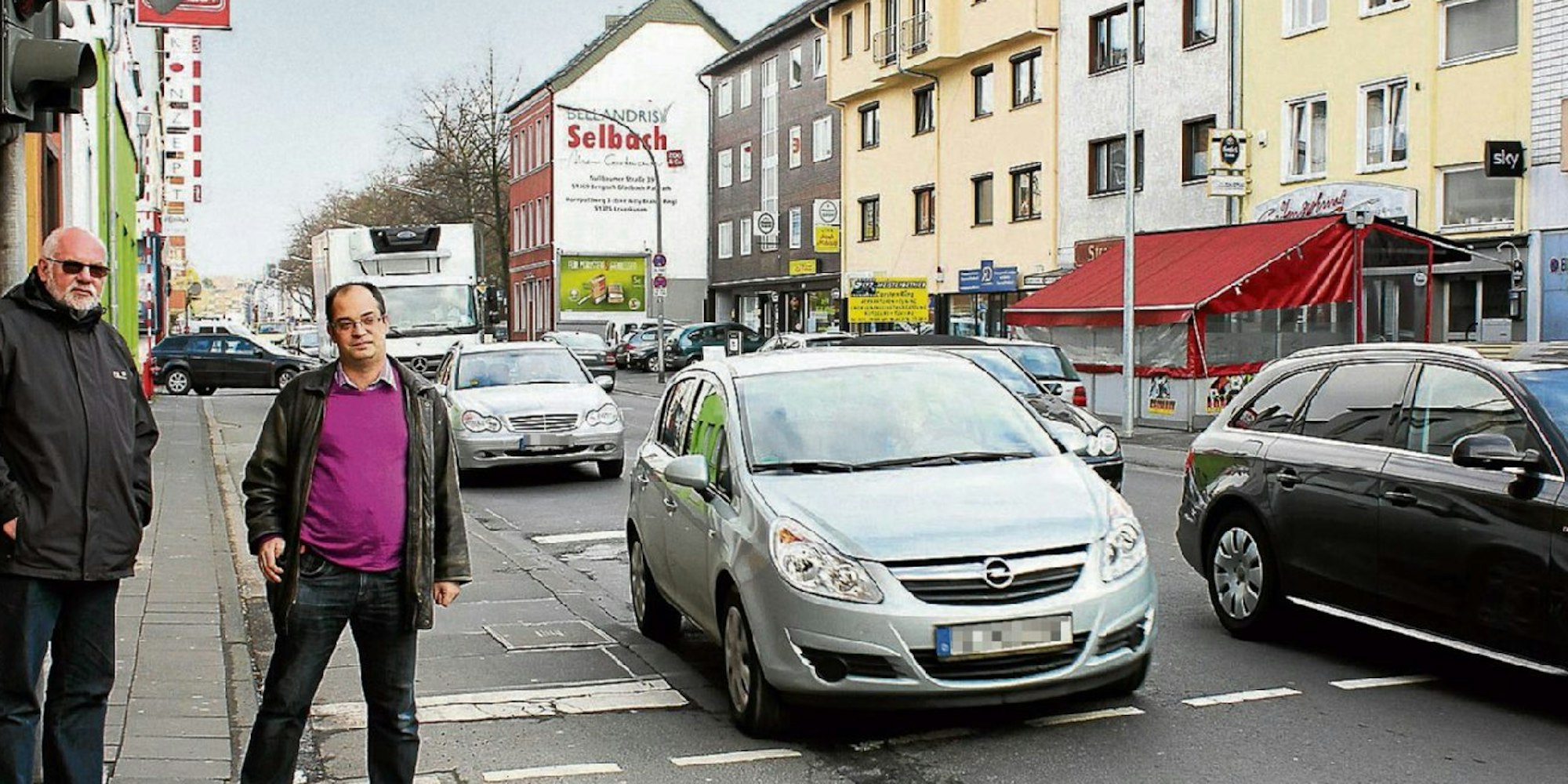 Horst Noack (l.) und Marc Schneiders wollen die Kreuzung Bergisch Gladbacher Straße/Dellbrücker Hauptstraße sicherer machen.