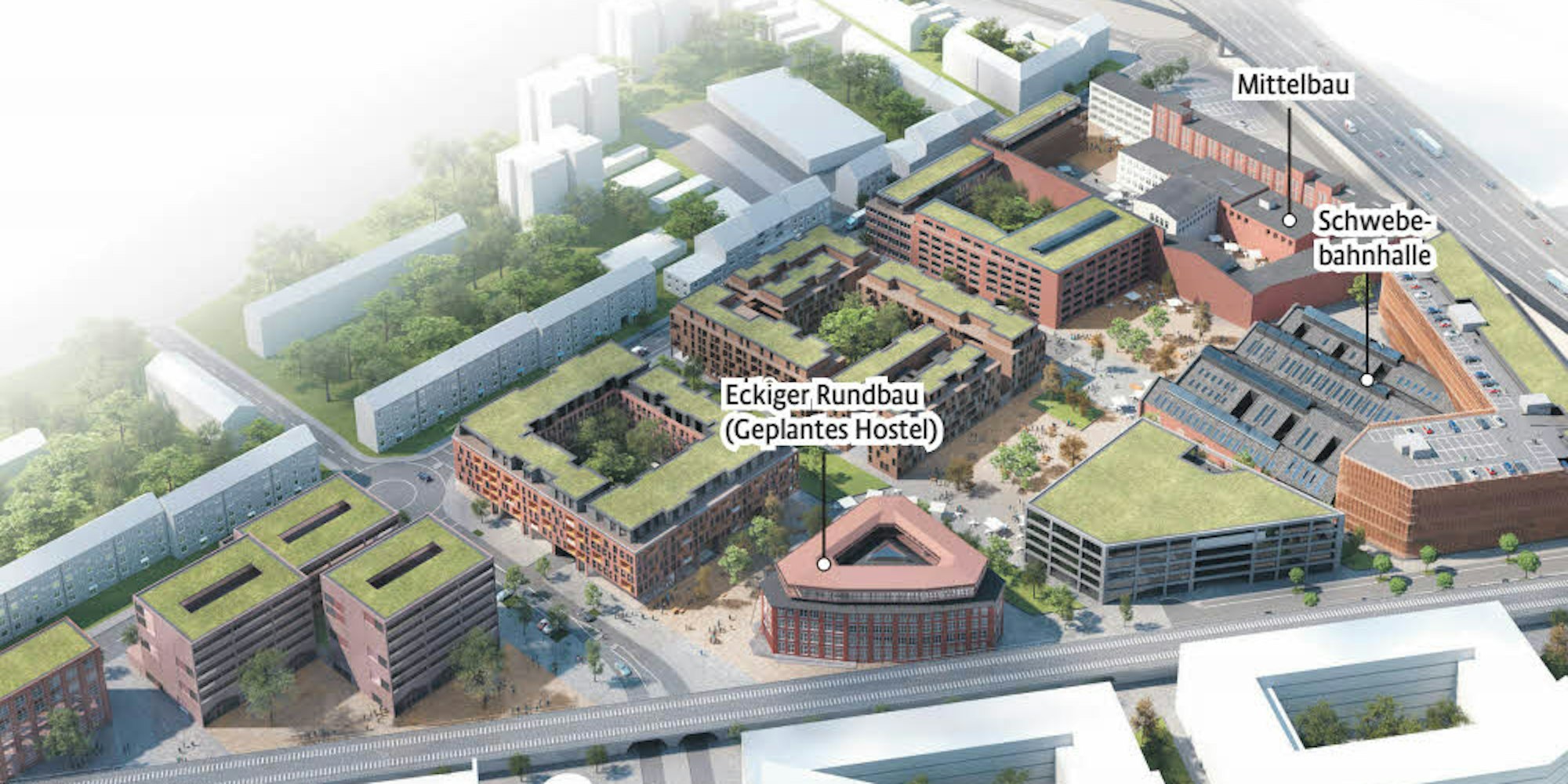 Zwischen Schwebebahnhalle und Eckiger Rundbau wird ein Bürogebäude errichtet. Ebenfalls Büros, mit Handelseinrichtungen im Erdgeschoss, werden im Dreieck nördlich der Stegerwaldstraße entstehen. Kleine Cafés, Werkstätten oder Galerien sollen die Bögen unter der ICE-Trasse beleben und die Villa Charlier wird zu einer Kindertagesstätte umgebaut. Die CG-Gruppe beabsichtigt, auf Erdwärme und Photovoltaik zu setzen. Gröner: „Das kostet kaum mehr als Fernwärme.“