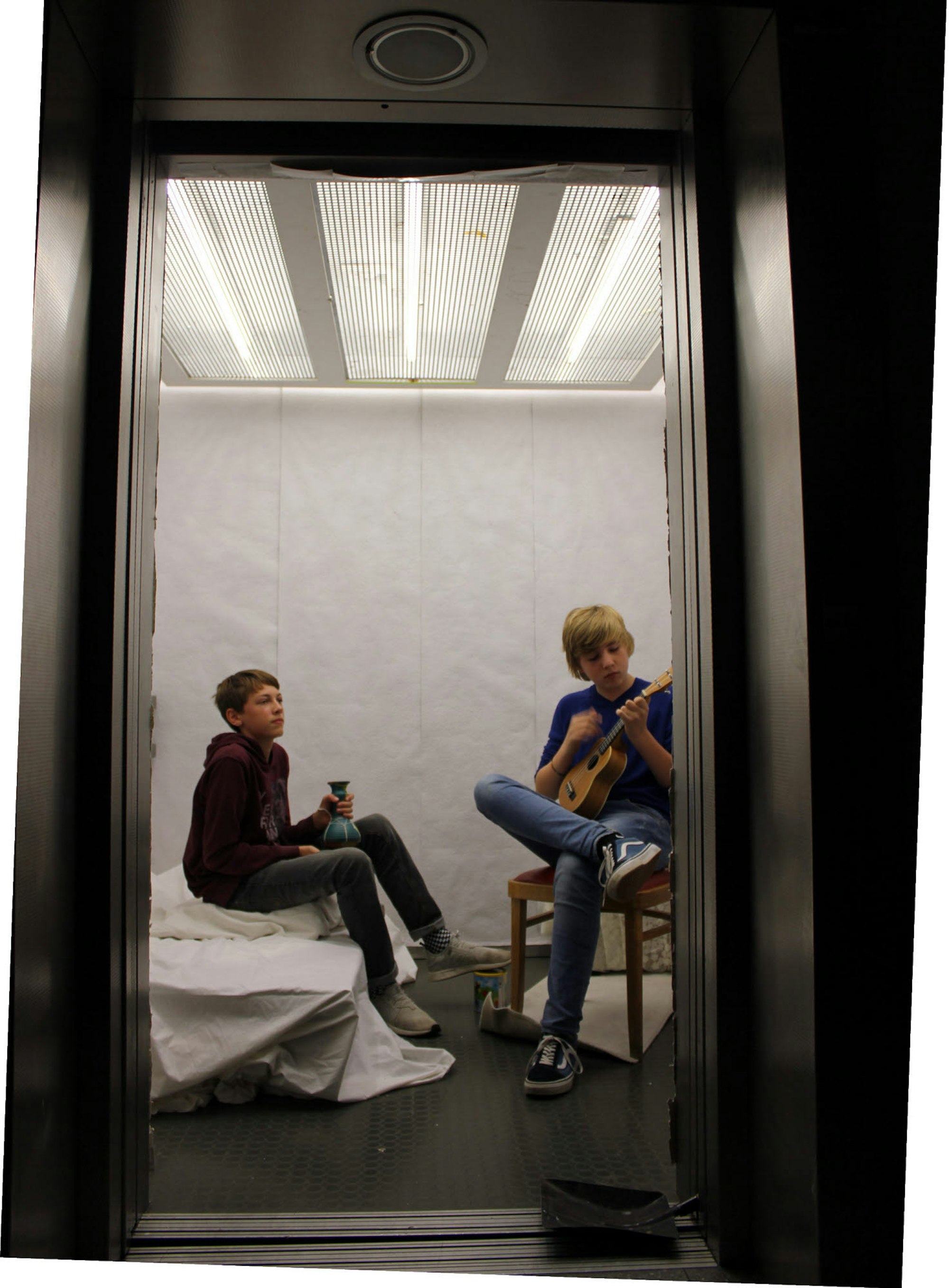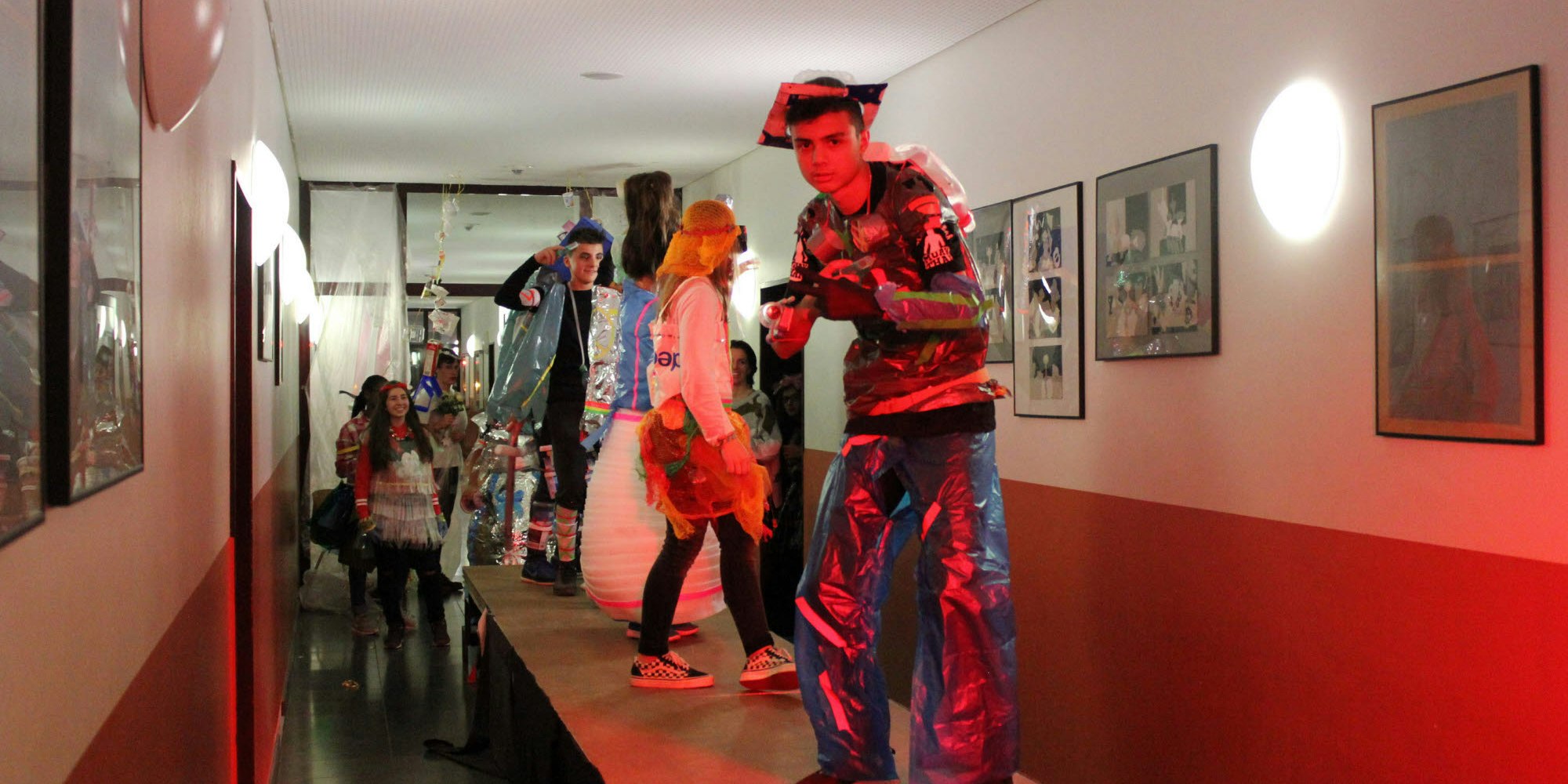 Der Aufzug wurde zum Musikzimmer; die Modenschau mit Kleidung aus Plastik, Mülltüten und anderen außergewöhnlichen Materialien kam beim Publikum gut an.