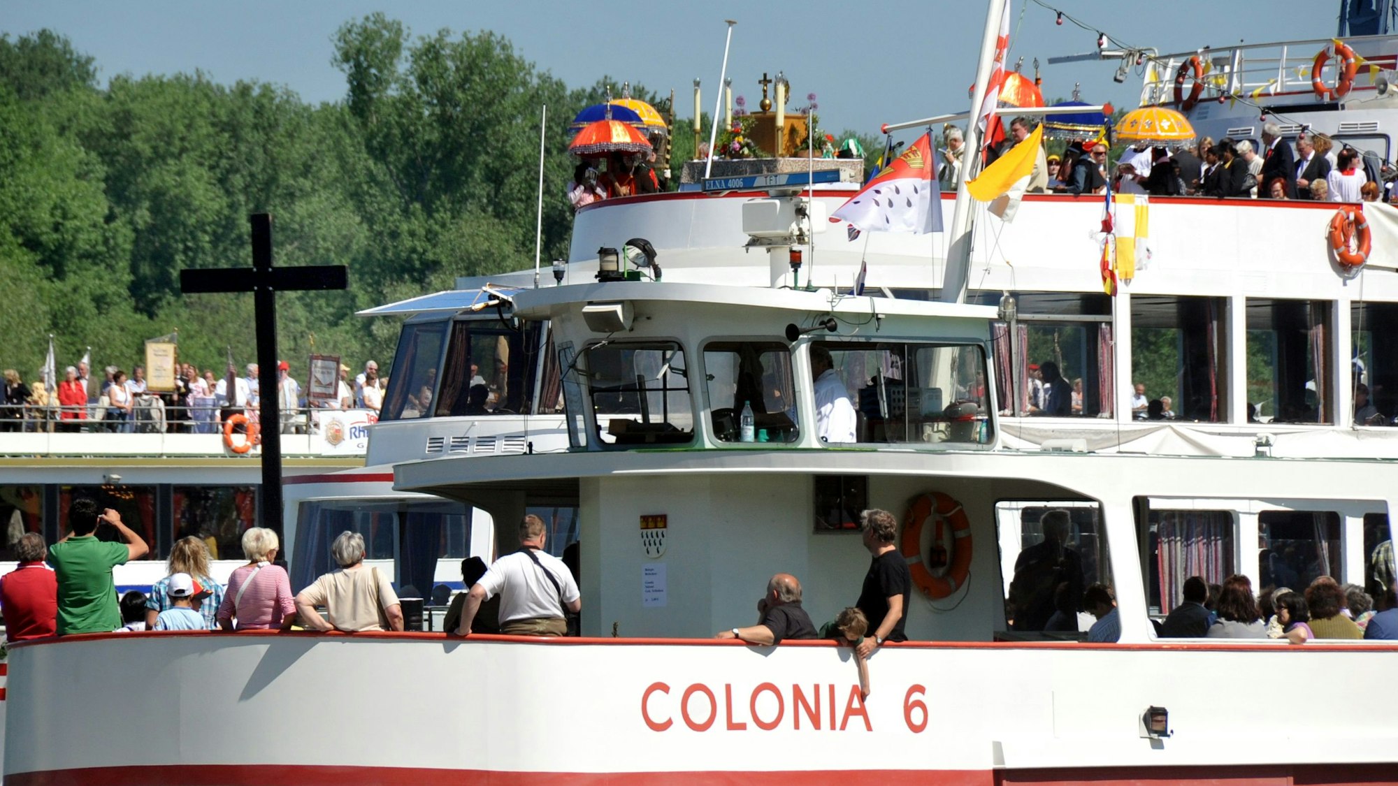 Bis 2019 fuhr auch noch das Schiff Colonia 6 - hier zu sehen bei der Mülheimer Gottestracht 2010 - das Mülheimer Rheinufer an.
