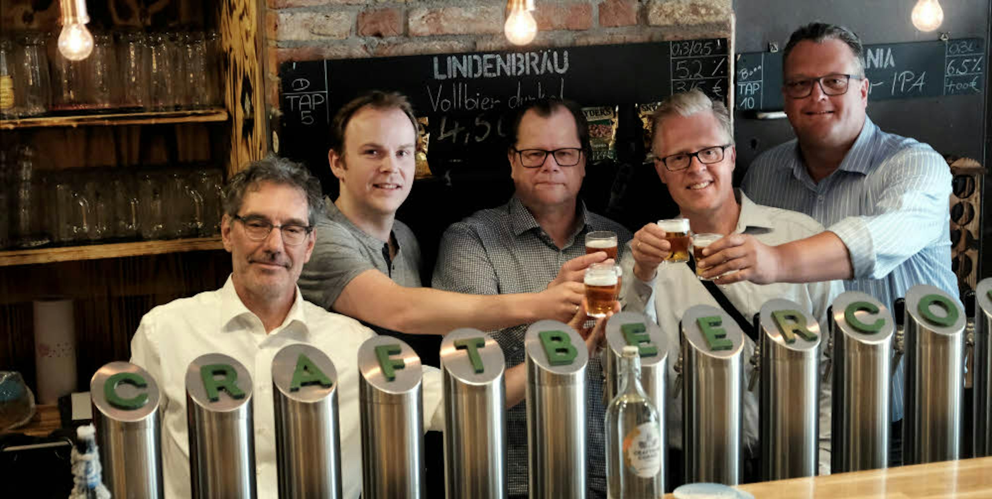 Organisator Michael Busemann (M.) mit den Craft-Beer-Brauern Michael Roeßgen (v.l), Stephan Hilbrandt, Thomas Deloy und Michael Müller