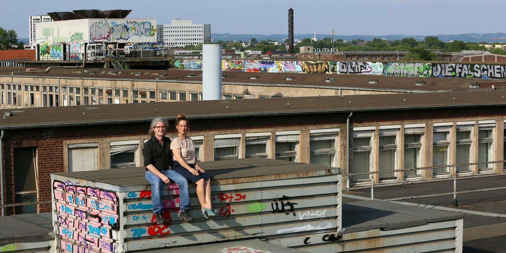Marc Leßle (l.) und Anja Kolacek (r.) auf dem Dach der ehemaligen KHD-Hauptverwaltung; im Hintergrund Teile des riesigen Mülheimer Areals, aus dem ein neuer Stadtteil wird.