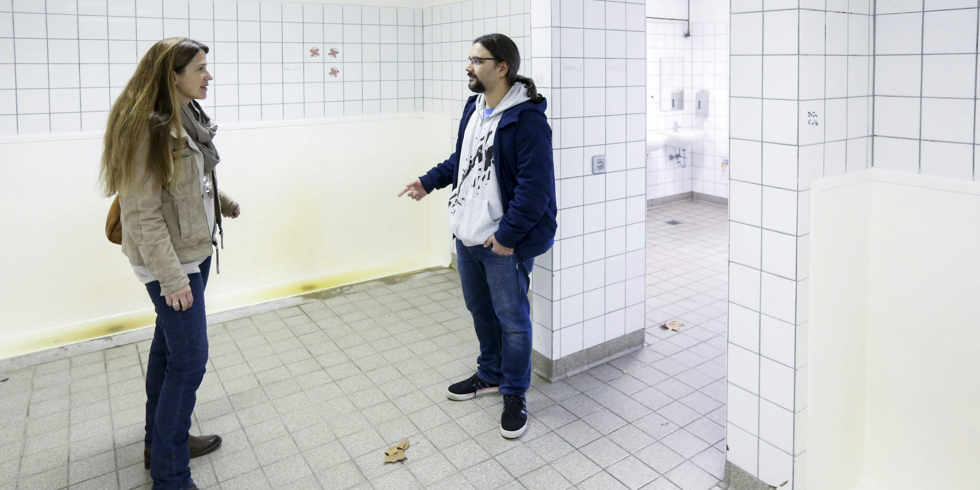 Melanie Berg und Sören Pöpper an der überlaufenden Pinkelrinne.