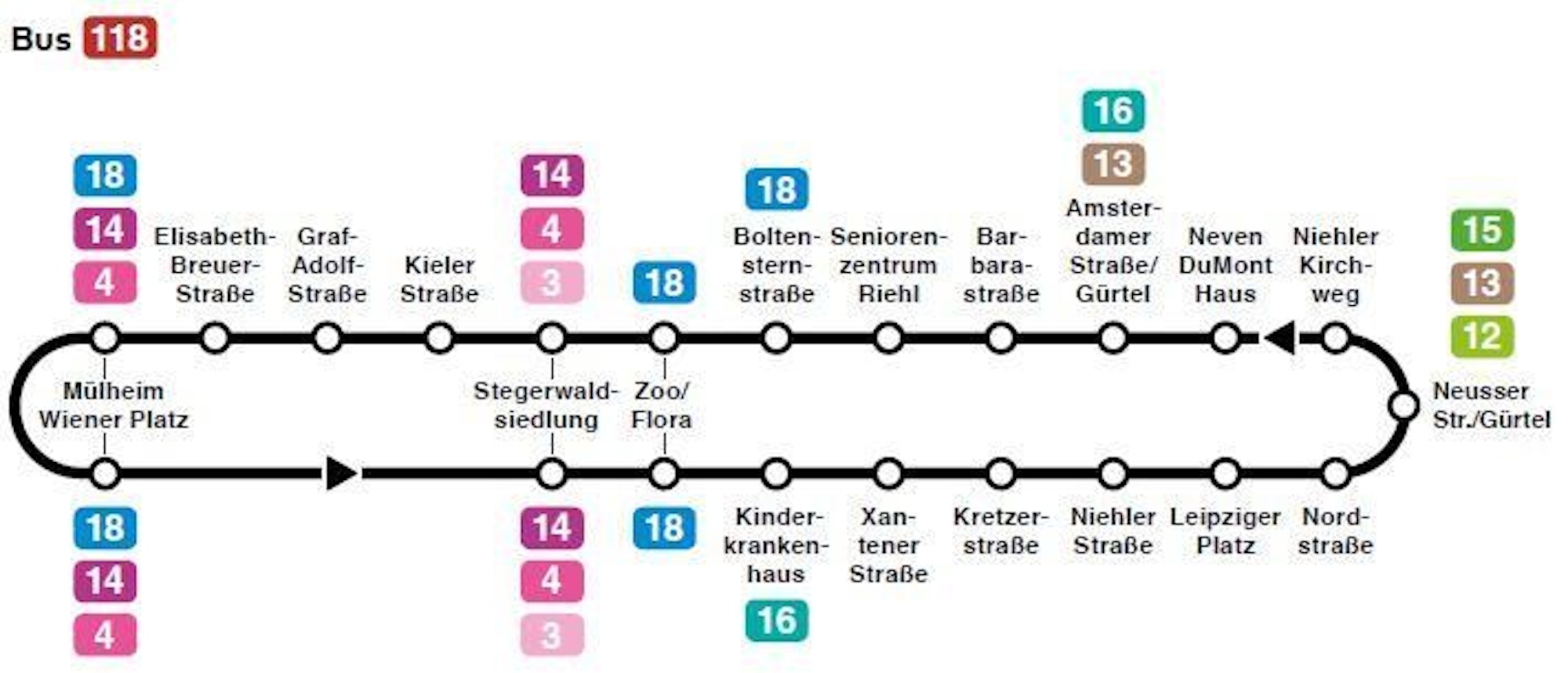 Für die Fahrgäste gibt es verschiedene Möglichkeiten, in den Ersatzbus 118 umzusteigen. Im Rechtsrheinischen ist dieser Umstieg für die Linien 3 bzw. 4 an der Haltestelle „Stegerwaldsiedlung“ vorgesehen, für die Linien 4 und 14 an der Haltestelle „Keupstraße“. Im Linksrheinischen kann vor allem an der Haltestelle „Neusser Straße/Gürtel“ zwischen den Linien 12, 13, 15 und 118 sowie an den Haltestellen „Zoo/Flora“ und „Boltensternstraße“ zwischen den Linien 18 und 118 umgestiegen werden. Zur Erleichterung des Zugangs zu den Gleisen der Linie 18 wird an der Station „Slabystraße“ ein temporärer Bahnübergang eingerichtet.