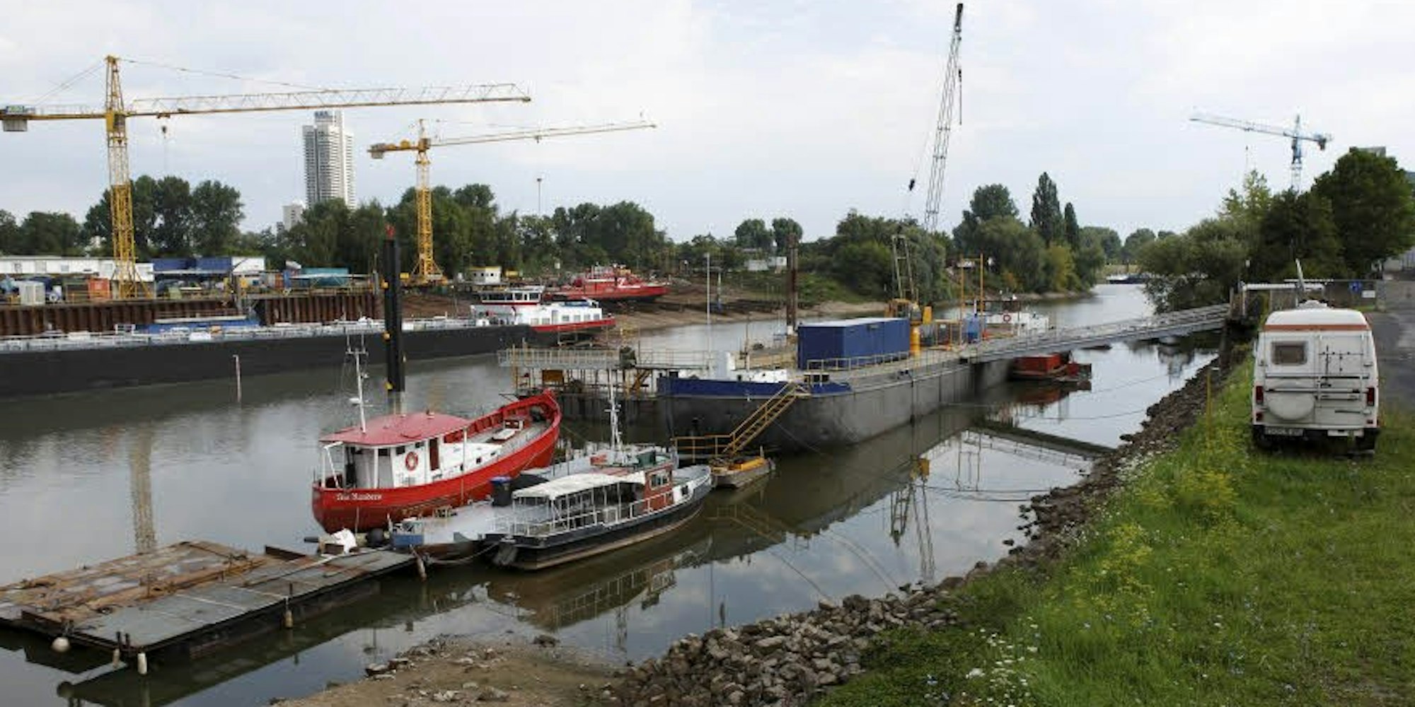 Er nennt den Hafen „Abenteuerland“ – das gilt für die Arbeit an Frachtern und Kreuzfahrtschiffen, für die Taucher, Diskobetreiber, Erfinder, Schiffsbauer, Filmemacher, Künstler, die sich hier tummeln. Für die Stadt ist das Areal auch irgendwie ein Abenteuerspielplatz – auf dem sie sich schon ordentlich verlaufen hat: Der Rat hatte 2005 beschlossen, im Hafen Gewerbe und Wohnungen anzusiedeln. Politiker sahen schon einen zweiten Rheinauhafen vor der Zoobrücke glitzern. Hatten aber wohl übersehen, dass das Gelände und der angrenzende Grund dem Bund und Privateigentümern gehören. Und, dass das Gewässer als Nothafen dient, der in Betrieb bleiben muss. Burgen bauen verboten. Vorläufig.