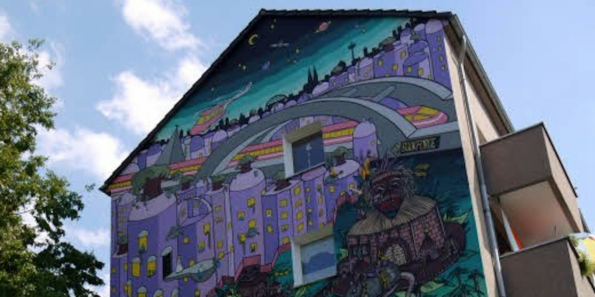 Nun haben sie mit fiktiven Zukunftsszenarien – weitgehend in Lila- und Türkis-, in Blau- und Grüntönen gehalten – die zuvor triste Hausfassade eines dreistöckigen Wohngebäudes (Im Bischofsacker 14) zur Heidelberger Straße in Buchforst hin verschönert.