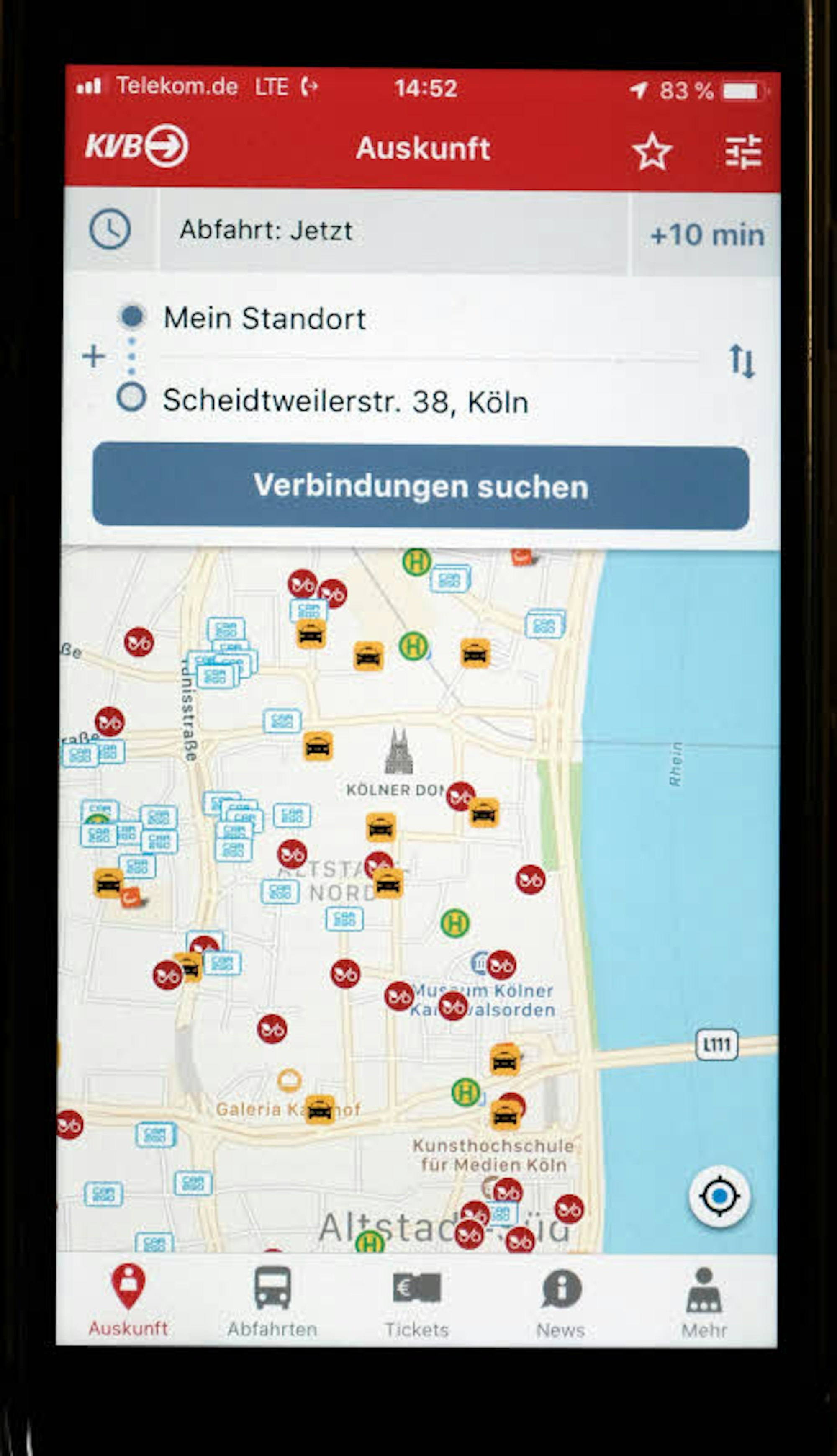 Köln – Rund sechs Jahre ist es her, dass die Kölner Verkehrs-Betriebe (KVB) eine eigene Smartphone-App auf den Markt brachten. Die aktuell geschätzten 140.000 Nutzer seien ein beachtlicher Erfolg, resümiert die KVB. Im Netz bewerten Nutzer die Anwendung allerdings nur mit mageren 1,5 bis zwei von fünf Sternen. Eine neue App soll nun zuverlässiger, vielseitiger und einfacher zu bedienen sein als ihr Vorgänger. Das Gemeinschaftsprojekt mit dem Verkehrsverbund Rhein-Sieg (VRS) schlägt mit 1,2 Millionen Euro zu Buche.