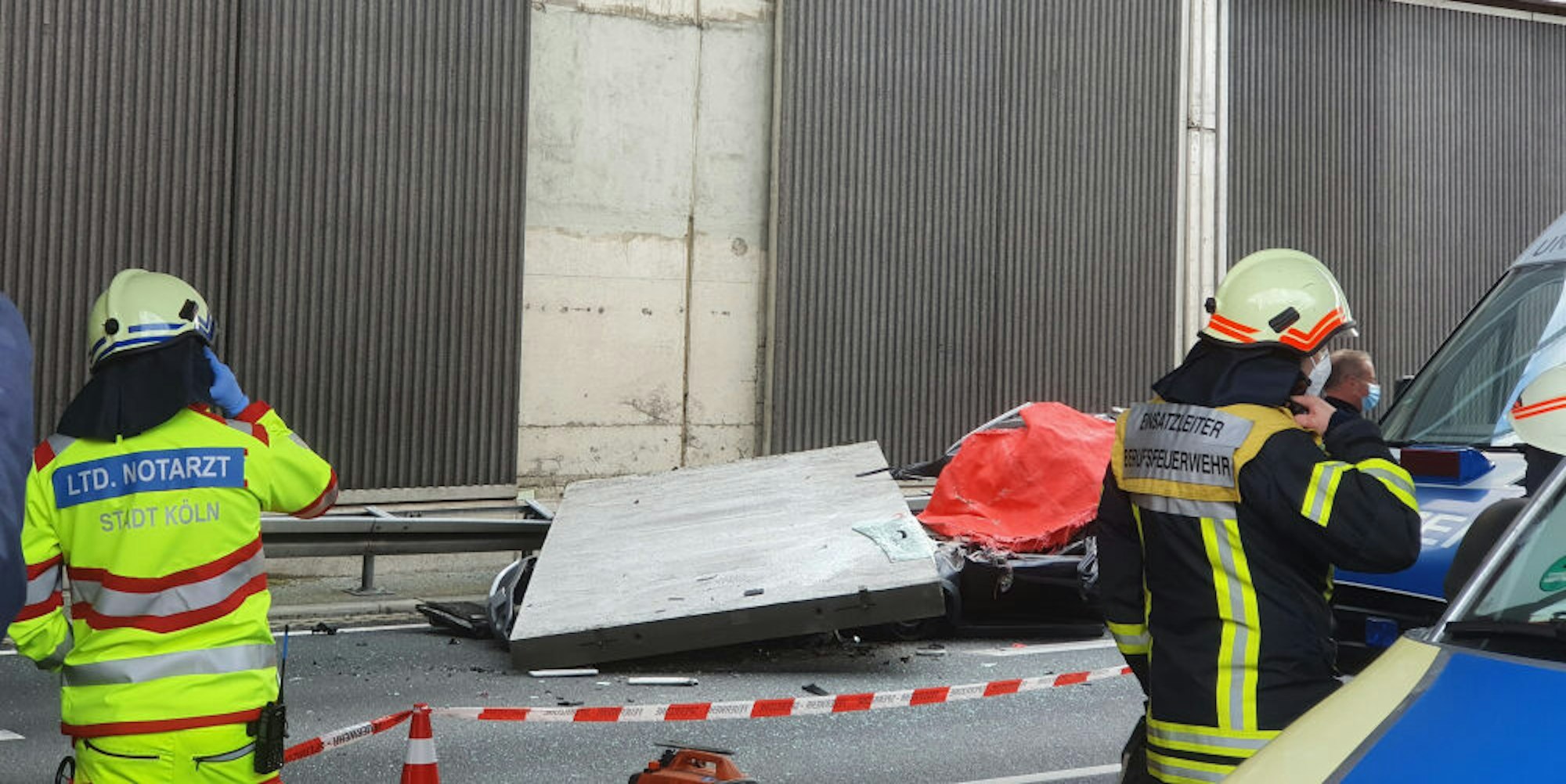 Am Freitag war eine fünf Tonnen schwere Betonplatte von einer Lärmschutzwand auf der A3 in Köln vor der Anschlussstelle Dellbrück auf ein Auto gestürzt. Die Fahrerin des Wagens starb, ihr Auto wurde zertrümmert. (dpa)