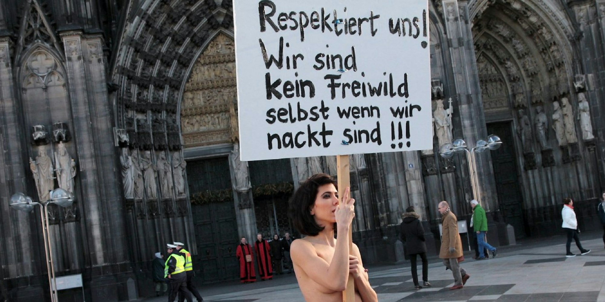 Performance zu den Übergriffen in KölnSchweizer Nacktkünstlerin Milo Moiré protestiert auf der Domplatte