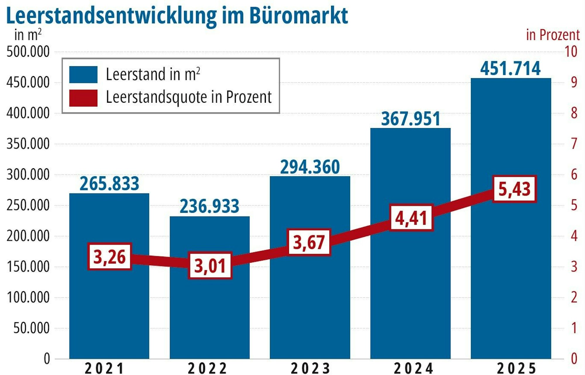 Laut neuer Zahlen der städtischen Wirtschaftsförderung Köln-Business standen 2025 Büroflächen von insgesamt 451.714 Quadratmetern leer. Das sind 5,43 Prozent des Kölner Marktes, der laut diesem Marktbericht insgesamt 8,3 Millionen Quadratmeter umfasst. Köln-Business mittelte Daten aus Berichten mehrerer größerer Maklerhäuser, darunter Angermann NRW, BNP Paribas Real Estate und Greif und Contzen. Der Leerstand nimmt seit vier Jahren weiter zu, 2022 lag die Quote noch bei drei Prozent.