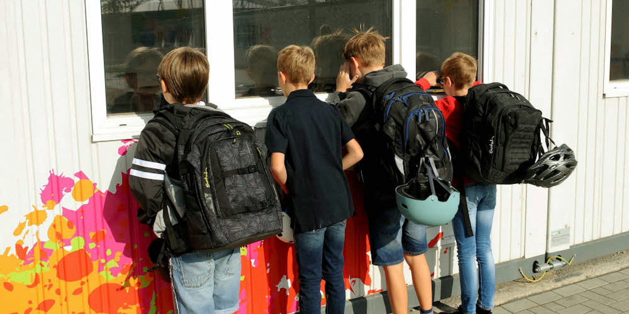 Ein neugieriger Blick ins Container-Innere: Die neuen Fünftklässler schauen am ersten Schultag vorm Unterrichtsbeginn durchs Fenster.