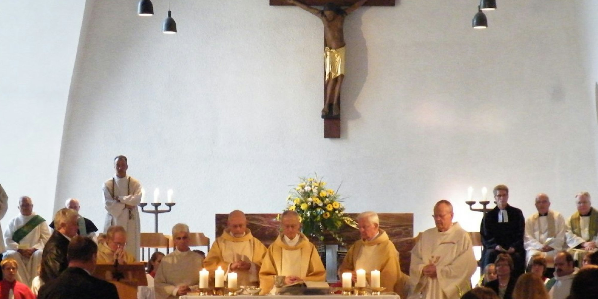 Würdevoller Augenblick in St. Engelbert: Helmut Strobel (Mitte) feiert mit der Gemeinde seine letzte Eucharistie als aktiver Pfarrer.