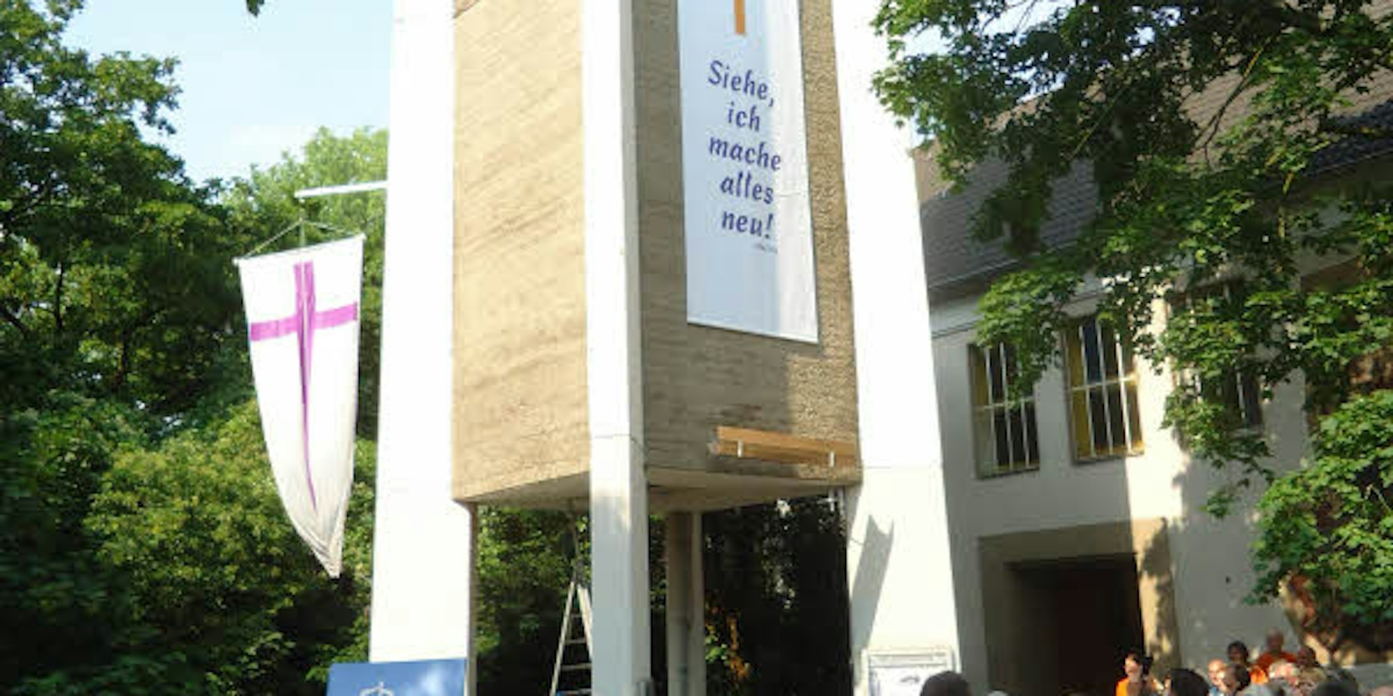 Weidenpesch/Mauenheim – „Siehe, ich mache alles neu!“ Vor weit mehr als 100 Gästen, die sich vor der alten Erlöserkirche versammelt hatten, wurde das Transparent am Glockenturm ausgerollt. Das weiße Banner mit dem Vers 21,5 aus der Johannes-Offenbarung bleibt bis zum endgültigen Abbruch der 1951 erbauten Kirche und des räumlich verbundenen Gemeindezentrums hängen. Mit einem fröhlichen, aber auch leicht wehmütigen Fest-Wochenende verabschiedete sich die Evangelische Kirchengemeinde Mauenheim/Weidenpesch nun von ihrem 67 Jahre alten Bauwerk an der Derfflingerstraße 9.