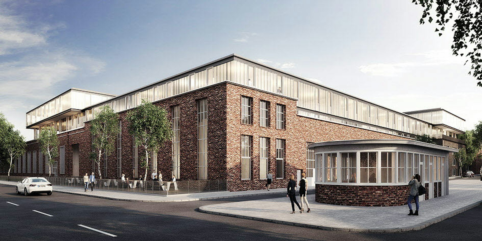 Blick von der Niehler Straße aus auf den Komplex Clouth 104 - mit denkmalgeschützter Backsteinfassade