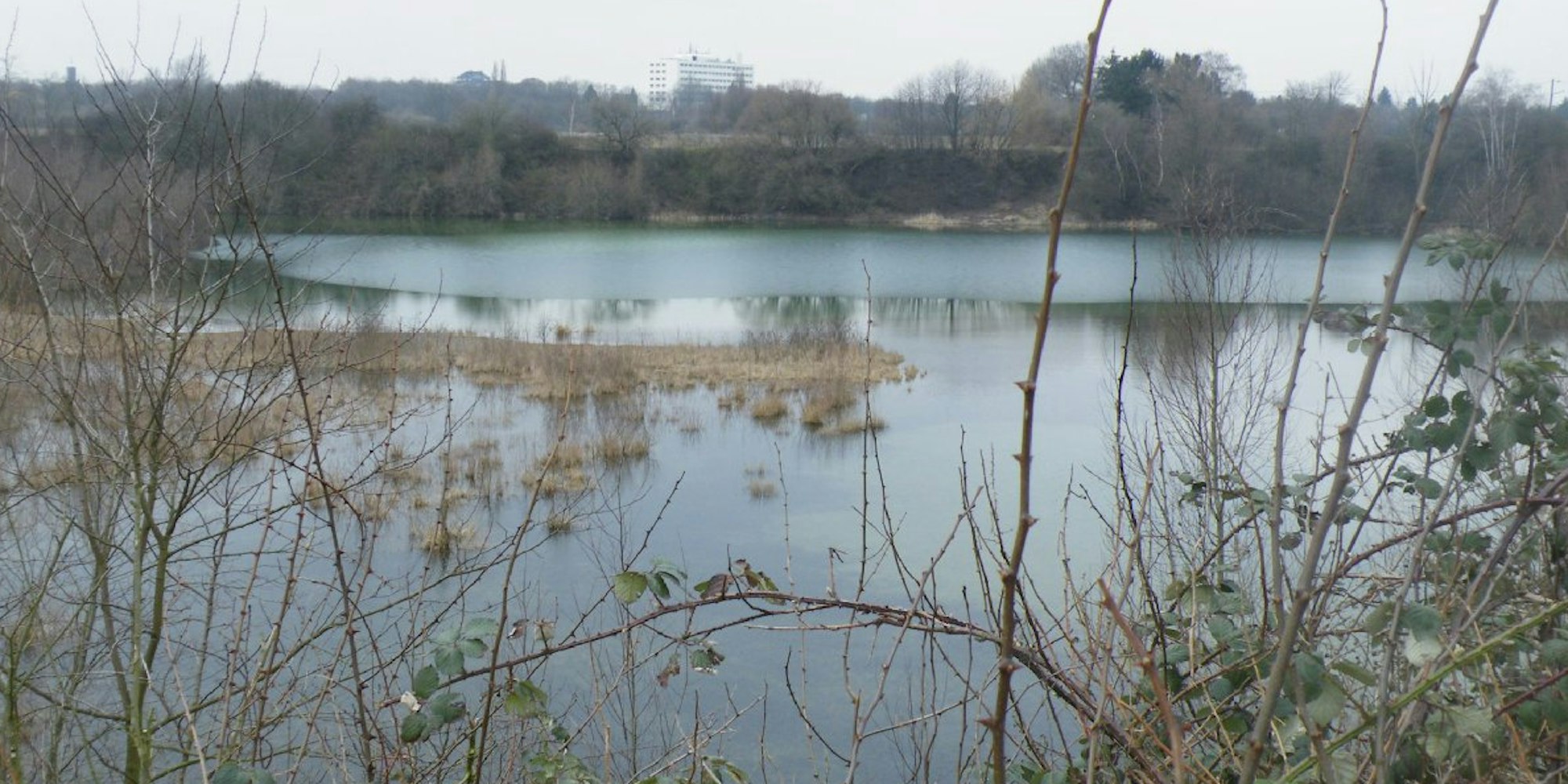 Blick vom Aussichtsplateau auf den See in der Schutzzone, am Horizont die Heilig-Geist-Klinik.
