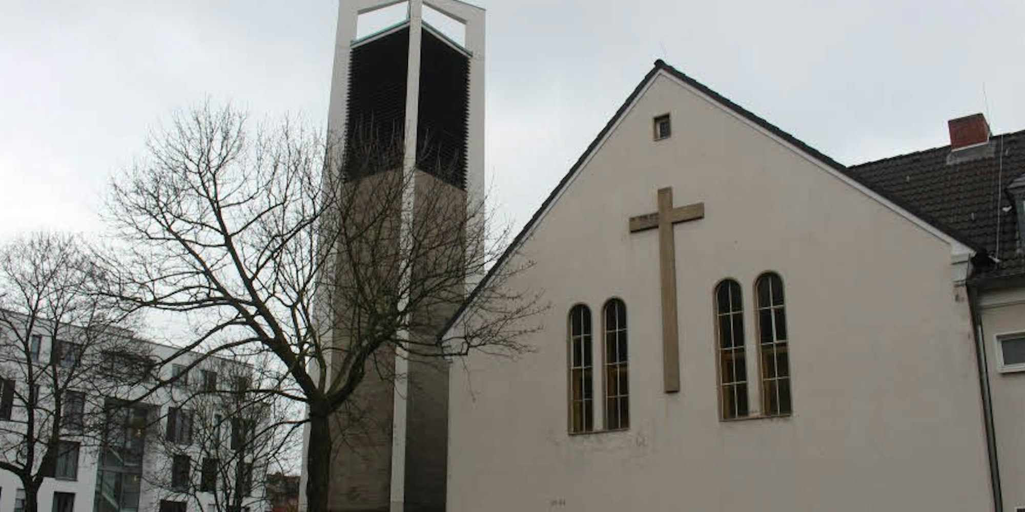 Weidenpesch – Es ist ein avantgardistisches, annähernd würfelförmiges Gebäude, das die in die Jahre gekommene Erlöserkirche beerben soll. Und es dürfte für Aufsehen im Ort sorgen: Der Neubau mit fünf Etagen soll die 1951 erbaute, nicht mehr renovierbare Kirche an der Derfflingerstraße 9 mitsamt Gemeinderäumen ersetzen. Markant ist der aufgesetzte Glockenturm, der den bisherigen dominanten seitlichen Turm der Erlöserkirche architektonisch zitiert. Vor dem Eingang des neuen Gotteshauses, nahe der Einmündung zur Hohenfriedbergstraße, entsteht laut der Pläne ein großzügiger Vorplatz mit Bänken. Die Bäume an der Straßenecke sollen dabei erhalten bleiben. Auch der Kindergarten der Kirchengemeinde sowie 13 Wohnungen, die in den oberen Etagen platziert sind, finden im Gebäudekomplex Platz. Ebenfalls zum Entwurf gehören eine Tiefgarage sowie Solarkollektoren auf dem Dach.