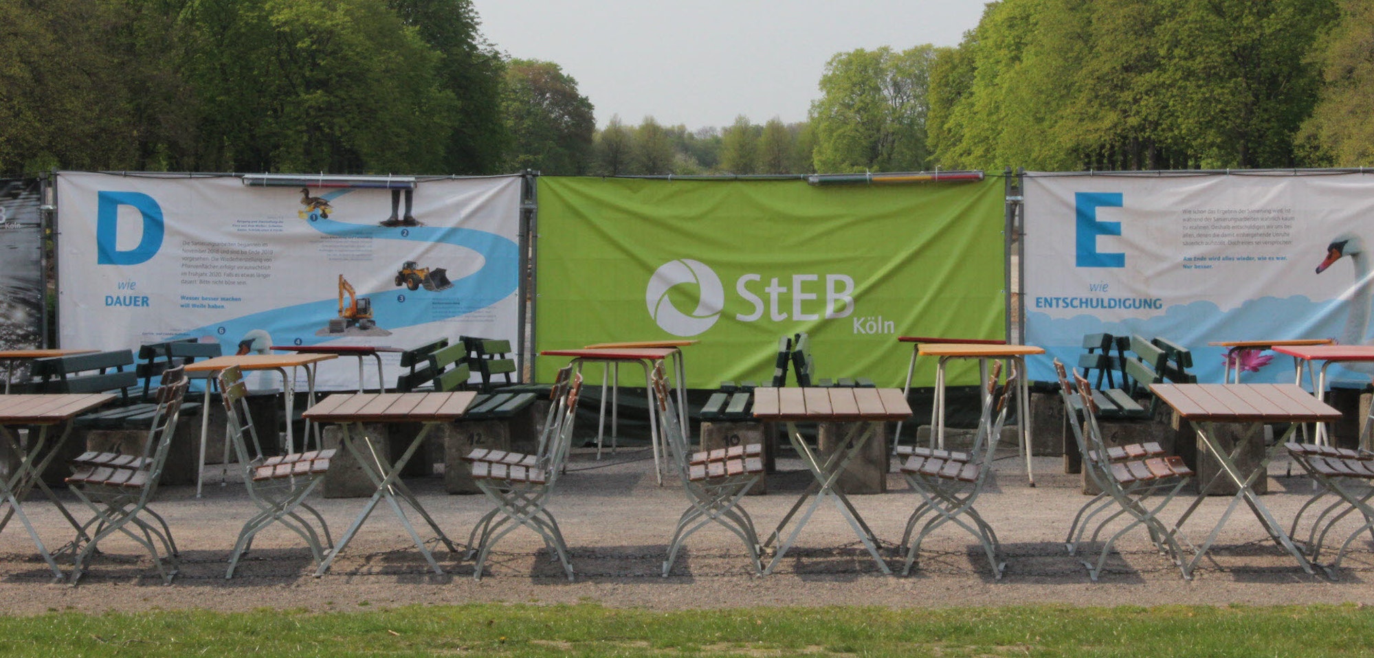 Für das Betreiber-Duo des Blücherpark-Kiosks, Petra Kortenhorn und Thomas Woller, ist es ein schwieriges Jahr: Die normalerweise direkt am Ufer liegende Biergarten-Terrasse ist wegen der Baustelle zu mindestens drei Vierteln abgezäunt. Doch die beiden wollen aus der Not eine Tugend machen: Unter dem scherzhaften Saison-Motto „Das lauschige Plätzchen an der Baustelle“ haben sie die Tische und Stühle eine Ebene höher gestellt, an den Rand der Liegewiese. Zubereitet, gezapft und serviert soll hauptsächlich aus einem Wagen heraus werden.