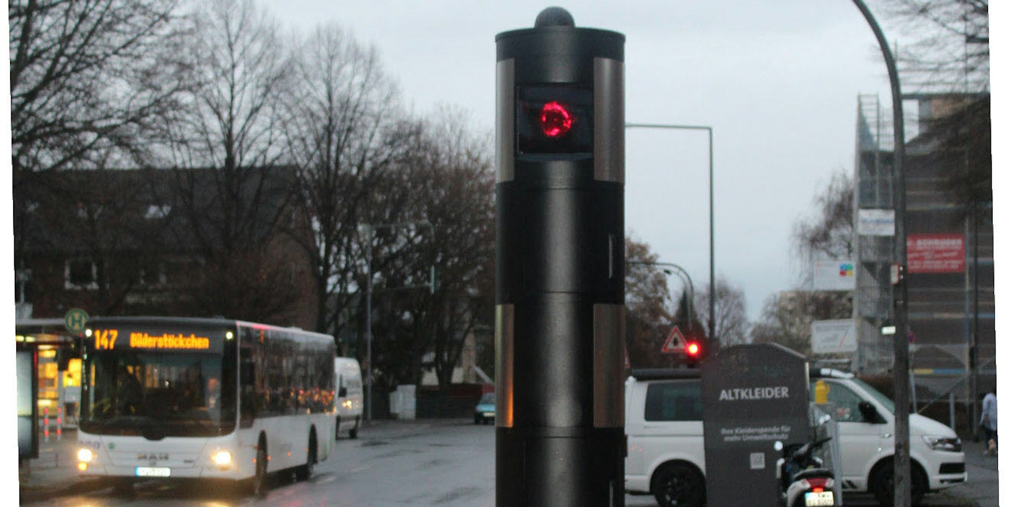 Bilderstöckchen/Dellbrück – Sie ist da – ab sofort wird auf dem Schiefersburger Weg scharf geschossen: In den vergangenen Tagen hat das Amt für öffentliche Ordnung eine Blitzersäule auf der Durchgangsstraße von Bilderstöckchen aufgestellt. Das hochmodern wirkende, anthrazitfarbene Gerät steht in Höhe der Hauptschule Reutlinger Straße und der Einbahnstraßen-Ausfahrt der Hunsrückstraße. Es kann in beide Richtungen blitzen, weil zwei laserbasierte Messeinrichtungen integriert sind.