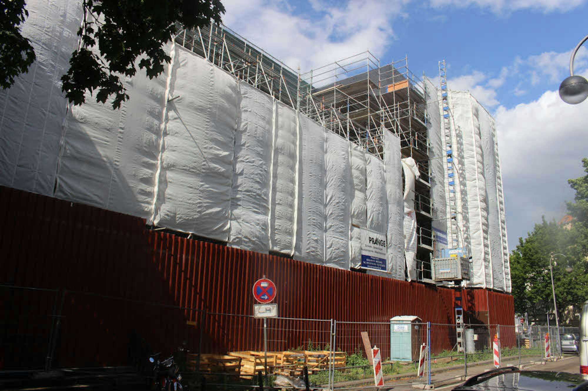 Blick auf das sieben Etagen umfassende Gerüst, das an der Südseite befestigt ist.