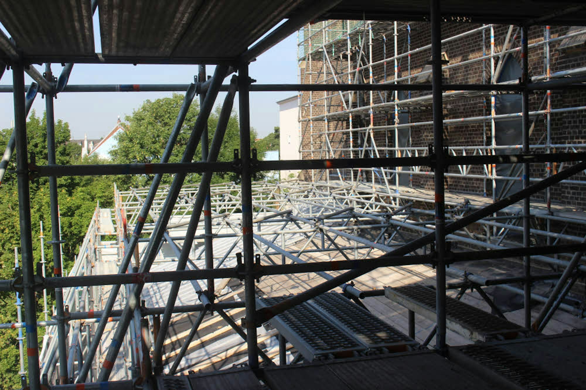 Wenn die Arbeiten an der Südseite erledigt sind, wird das Gerüst ab- und im Bereich des Ostchors – zur Neusser Straße hin gelegen – wieder aufgebaut. Allein Demontage und Wiederaufbau des monumentalen Gerüstwerks dauern zusammen rund zwei Wochen. Nach einem weiteren halben Jahr sind dann Dach und Fassade auf der Nordseite der Kirche an der Reihe.