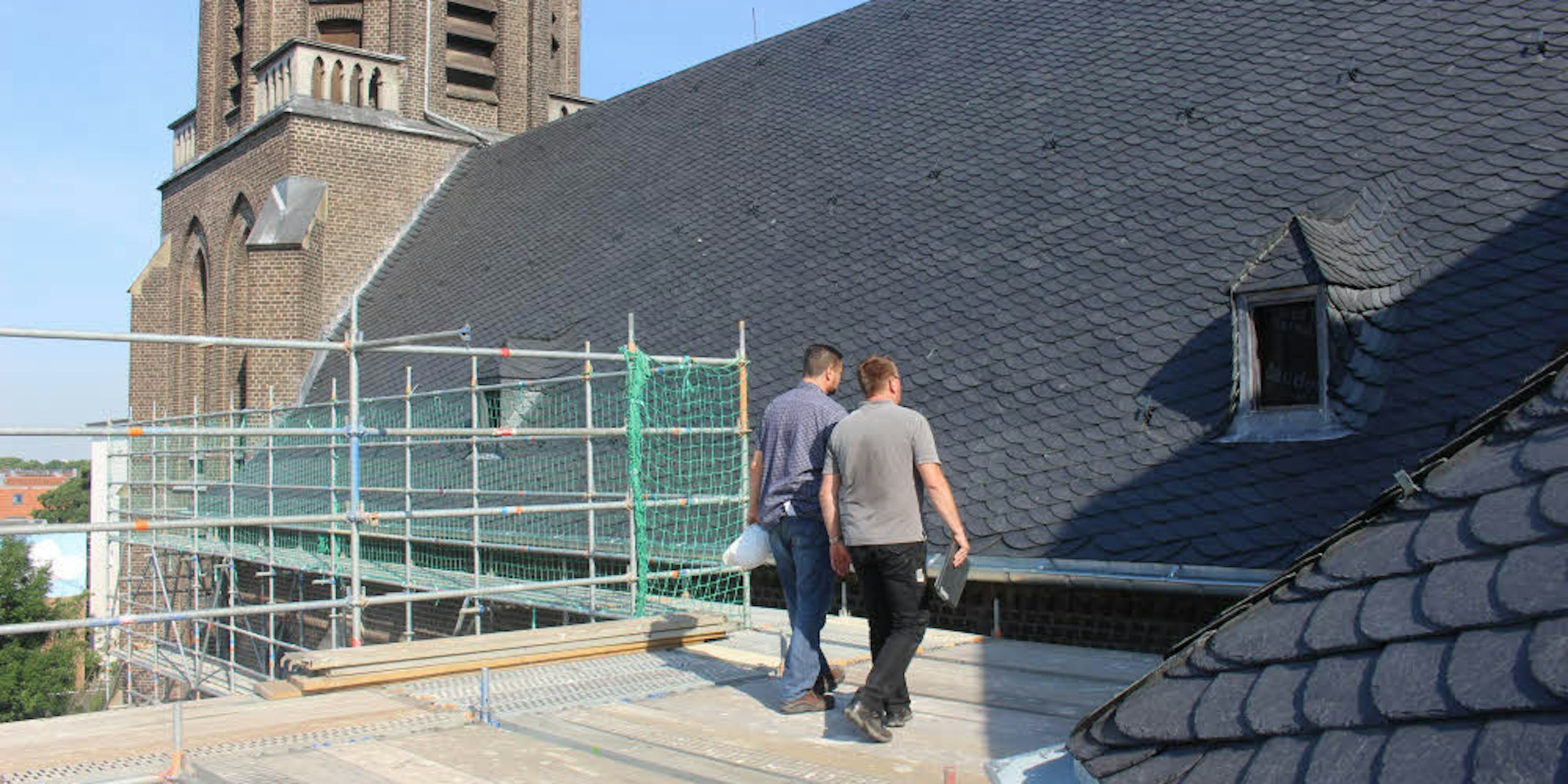 Köln-Nippes – Langsam, ganz langsam setzt sich der Lift in Bewegung, der an das Fassaden-Gerüst von St. Marien montiert ist. Er bringt die Arbeiter hinauf zur spektakulärsten Baustelle von Nippes: In mehr als 20 Metern Höhe, mit einem beeindruckenden Rundumblick über die Dächer des Veedels, ist die Sanierung an der Südseite der Kirche im Gange. Dort haben die Bauarbeiter in mühevoller Kleinarbeit die Platten des Schieferdachs ausgetauscht.