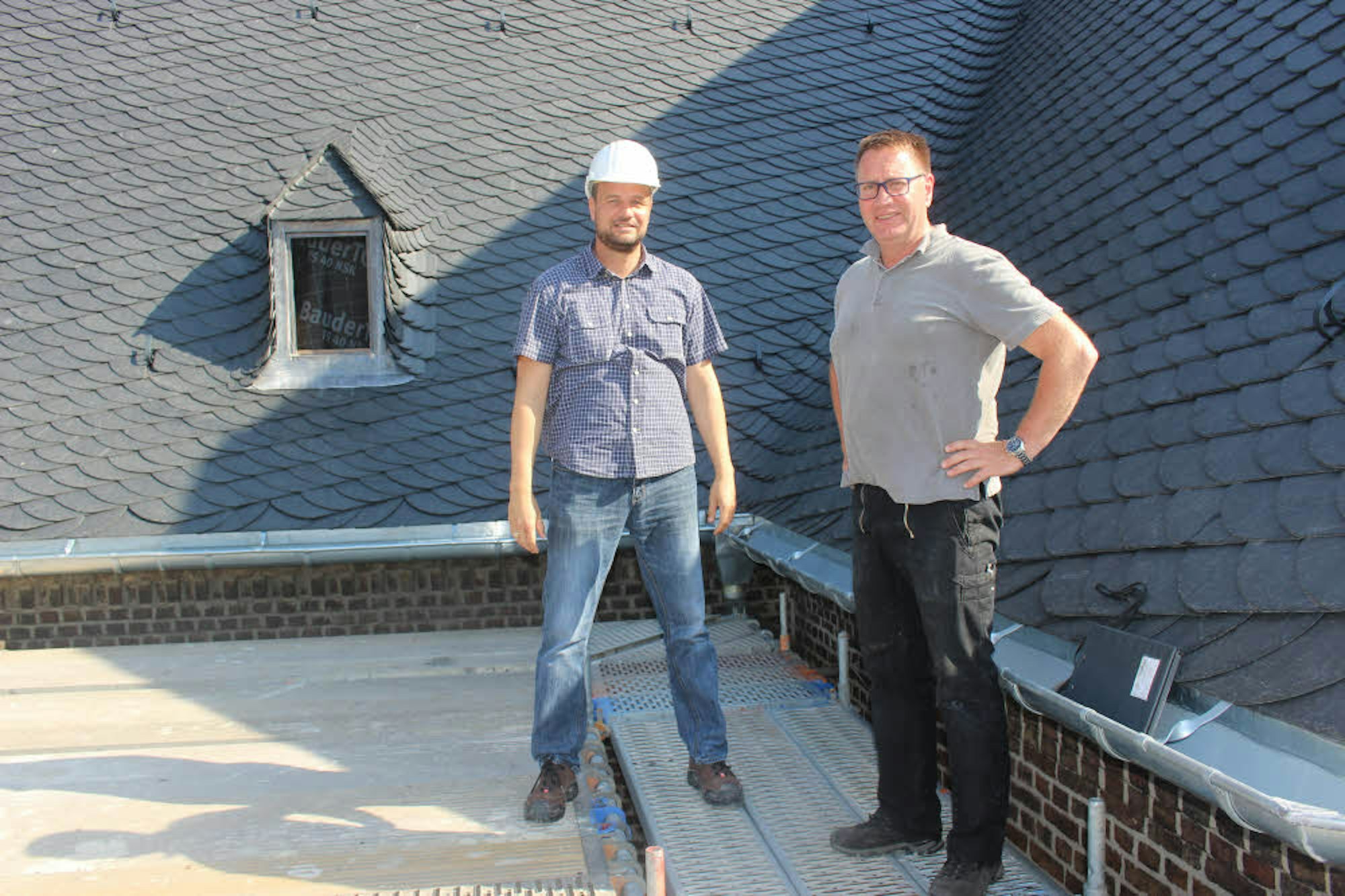 Der weitaus größte Teil des Daches an jener Seite ist inzwischen geschafft; es fehlt nur noch eine kleine Seitenpartie. „Wir verwenden Mosel-Schiefer, auf einen Quadratmeter kommen rund 30 Steine. Und jeder einzelne ist mit drei Nägeln befestigt“, erläutert Jens Kratzheller vom Architekturbüro Karl Band, das bei der Sanierung federführend ist.