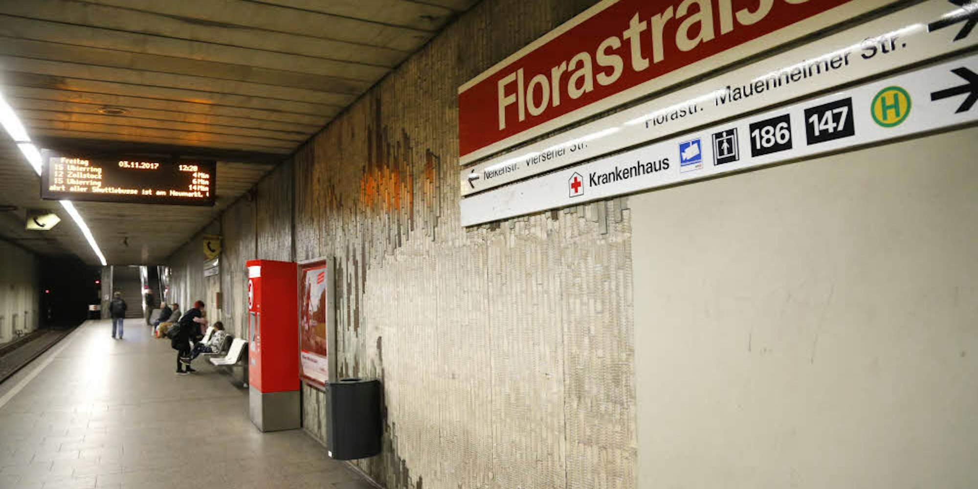 Köln-Nippes – An der KVB-Haltestelle Florastraße bröckelt es wieder. Auf beiden Bahnsteig-Seiten des unterirdischen Stopps für die Linien 12 und 15 im Nippeser Ortszentrum werden die weißen Löcher in der beige-braunen Fliesenwand immer größer; der nackte, triste Putz der Wand tritt hervor. An einigen kahlen Stellen, besonders prominent auf dem Bahnsteig in Richtung stadtauswärts, haben sich bereits Graffiti-Tagger „künstlerisch versucht“.
