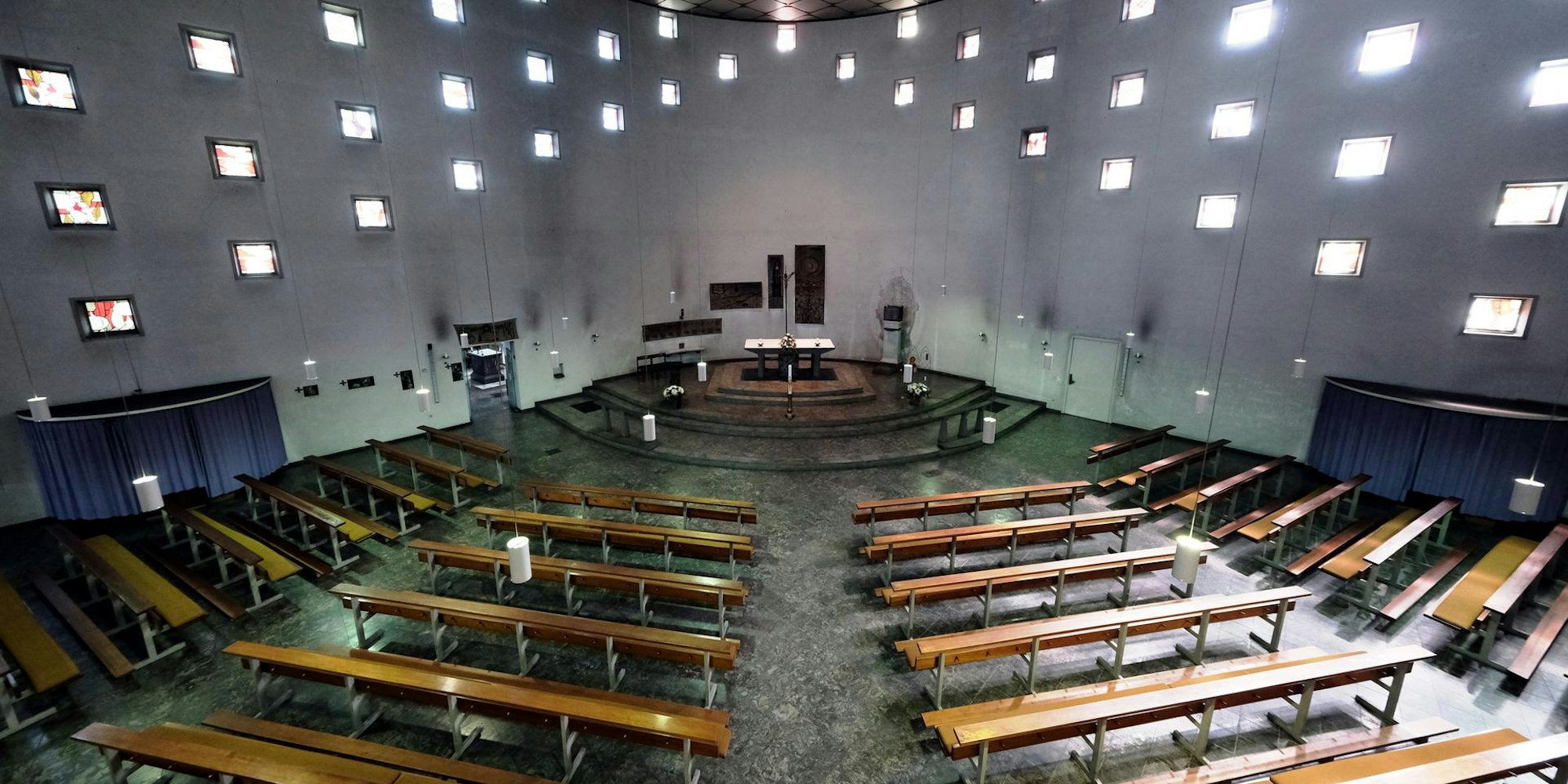 Nippes – Bei Regen tropft es von der Decke, die Heizungsanlage fällt im Winter aus, die Wände haben Risse. Die Kirche St. Hildegard in der Au in Nippes hat schon bessere Zeiten gesehen. Und trotzdem: Der hohe Raum mit den ungewöhnlich gebogenen Wänden strahlt immer noch eine ganz besondere Atmosphäre aus. Viele kleine Fenster in der Fassade erleuchten ihn. Sie sehen ein bisschen wie Schießscharten einer Burg aus. Vielleicht fühlt man sich hier deswegen so geborgen – auch ohne religiös zu sein.