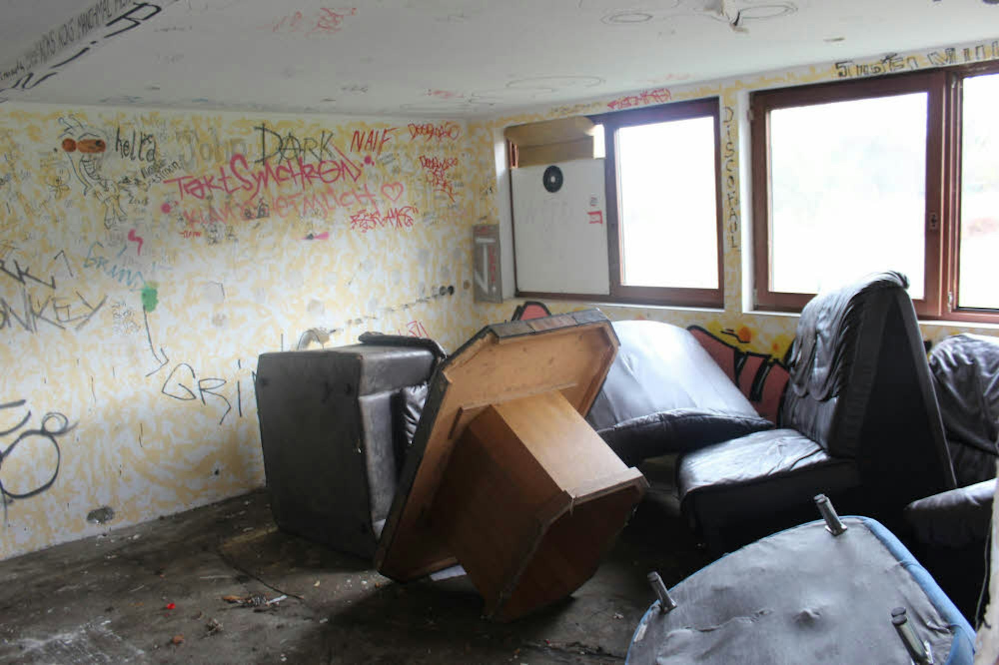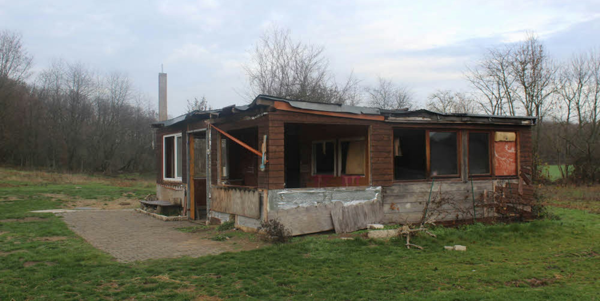 Etwas mulmig wurde einem schon: Vom Hauptweg führt ein Trampelpfad in das mit schief hängendem Maschendraht – an dem ein längst blindes und unleserliches Schild hing – abgezäunte Gelände. Man erblickte drei Gebäude: offensichtlich eine alte Stallung, eine Scheune und wohl eine Art kleines Club- oder Vereinsheim mit Küchenzeile und einer Theke. In den und rund um die Gebäude lag auch viel alter Plunder, Sperrmüll und Kanister, in einem kleinen Clubheim türmten sich schrottreife Möbel.