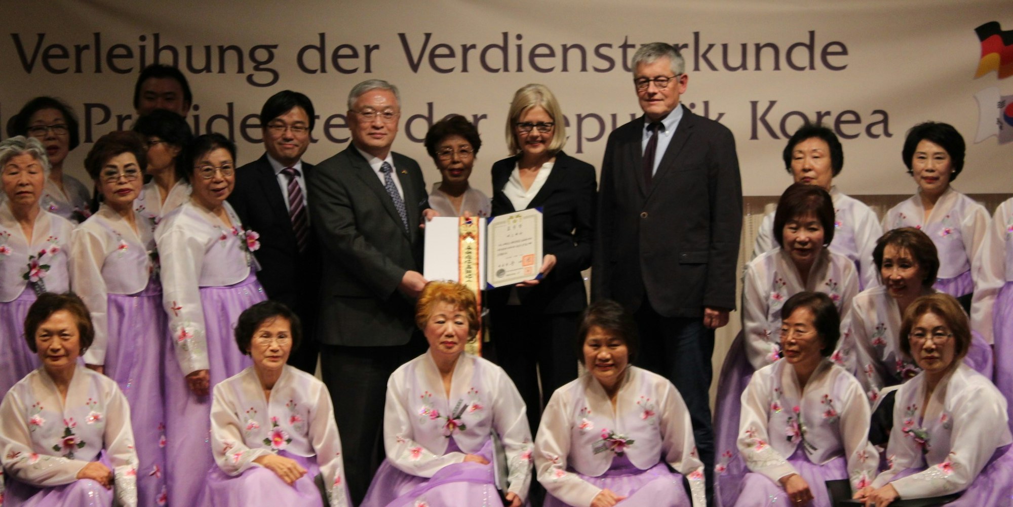 Der Chor der südkoreanischen Mitarbeiterinnen um Yeang-Ja Linke (Mitte) präsentiert mit Generalkonsul Lee Doo-young, SBK-Chefin Gabiele Patzke und ihrem Vorgänger Otto B. Ludorff (v.l.n.r.) die Auszeichnung.