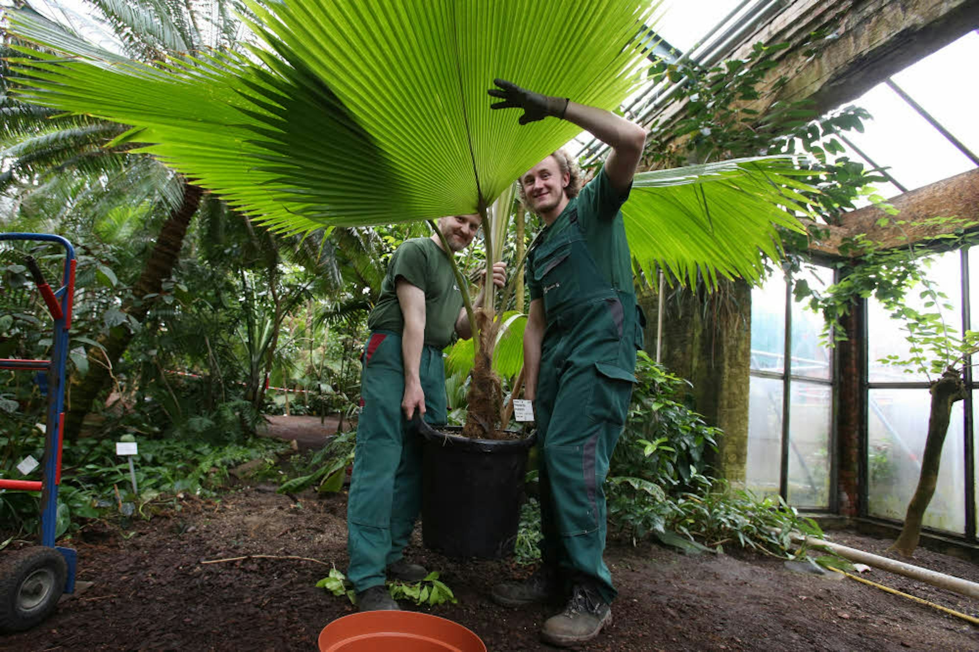 Für das Versetzen der größten und kostbarsten Pflanzen wird ein professionelles Unternehmen engagiert, das mit speziellen Maschinen und Fahrzeugen arbeitet. Dazu gehören unter anderem ein 150 Jahre alter Sagopalmfarn aus dem ostasiatischen Raum und ein 300 Jahre alter Stechender Palmfarn aus Südafrika. „Was schnell wächst, kann man nachziehen, aber solche Raritäten wollen wir selbstverständlich erhalten, zumal viele aufgrund der Artenschutzabkommen nicht mehr beschaffbar wären“, sagt Anhalt. Die zwei Kubanischen Königspalmen, deren Samen der Direktor vor 16 Jahren selbst von der Karibikinsel mitgebracht hatte, können zum Beispiel nicht umziehen, weil sie eingehen würden.