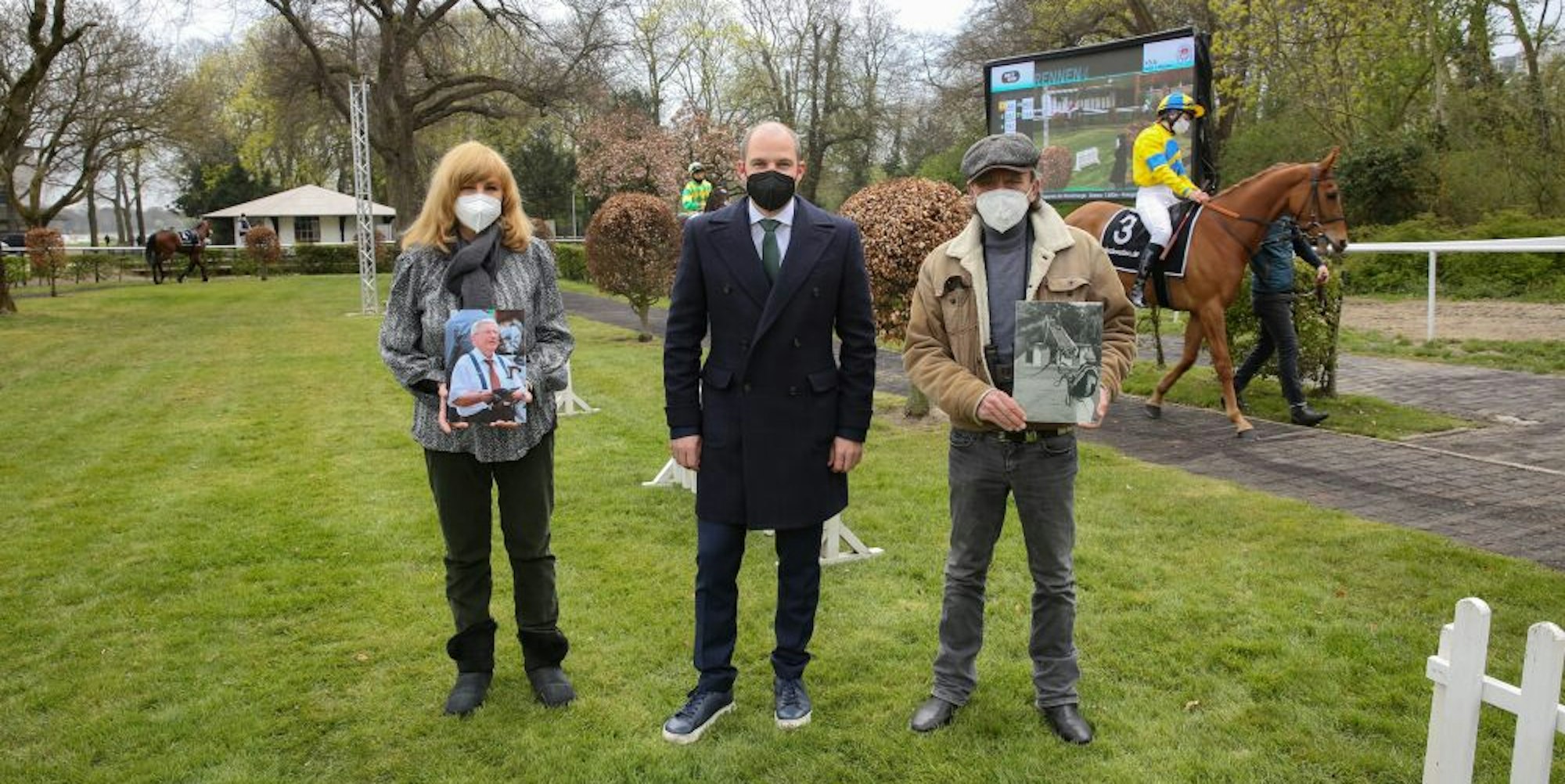 Philipp Hein (M.) vom Rennverein mit den Künstlern Heike Haupt und Anton Fuchs.