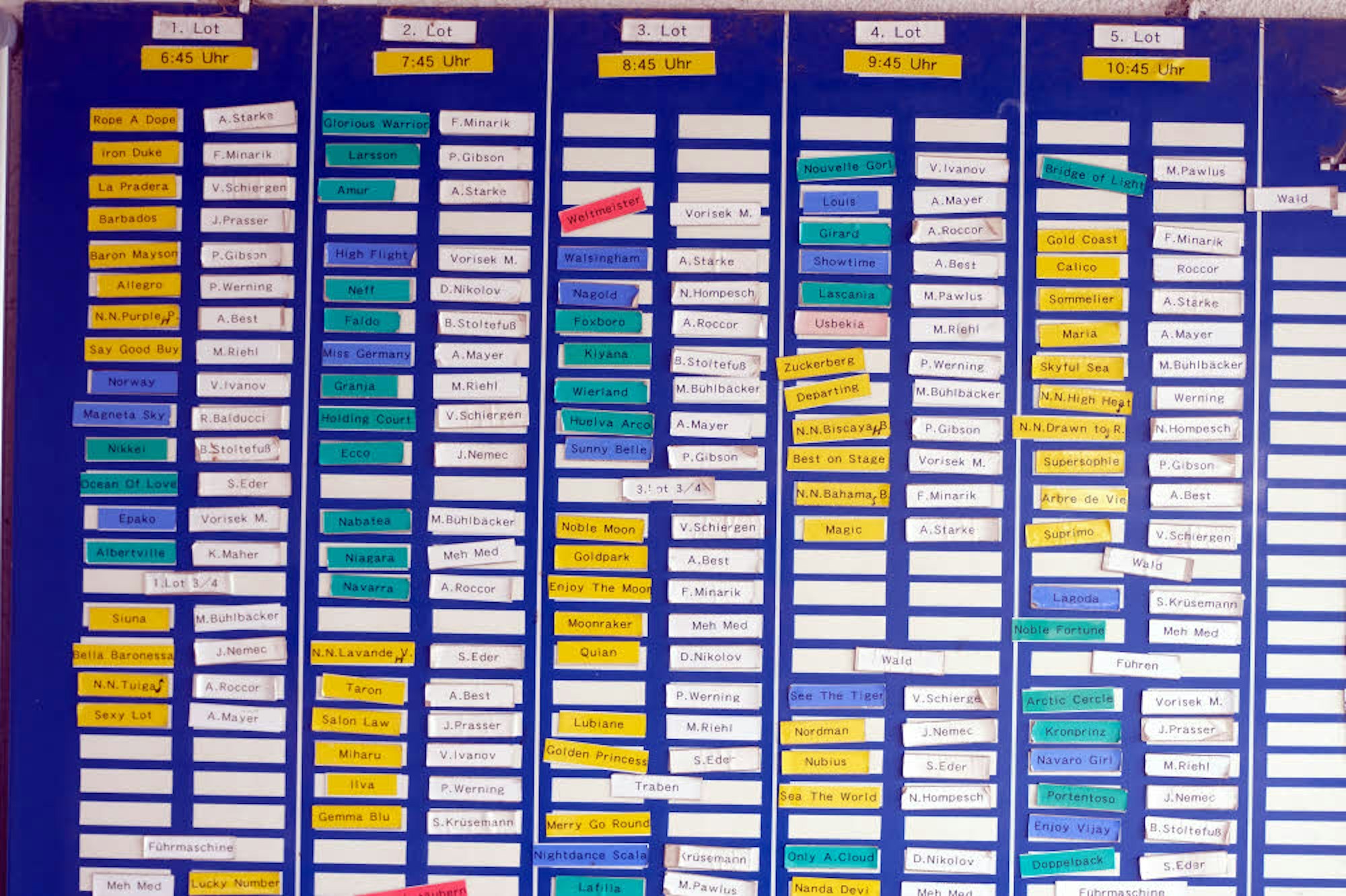 Arbeit heißt: jeden Tag umfangreiche Trainingseinheiten mit den Pferden; hinzu kommen dann die Galopprennen: Sonntag in Krefeld, Dienstag in Mülheim, Mittwoch in York, Donnerstag und Freitag in Paris. Samstag in Düsseldorf, Sonntag in Berlin und Montag in Köln und dann wieder von vorne.
