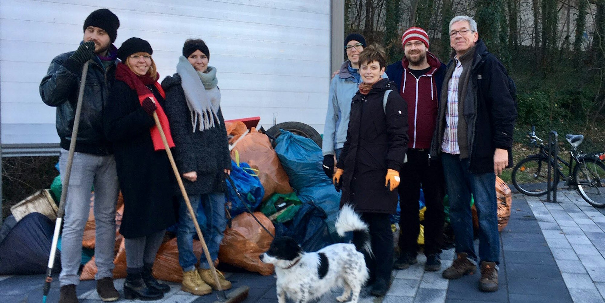 Eine Helfergruppe präsentiert einen Teil der gefüllten Müllsäcke