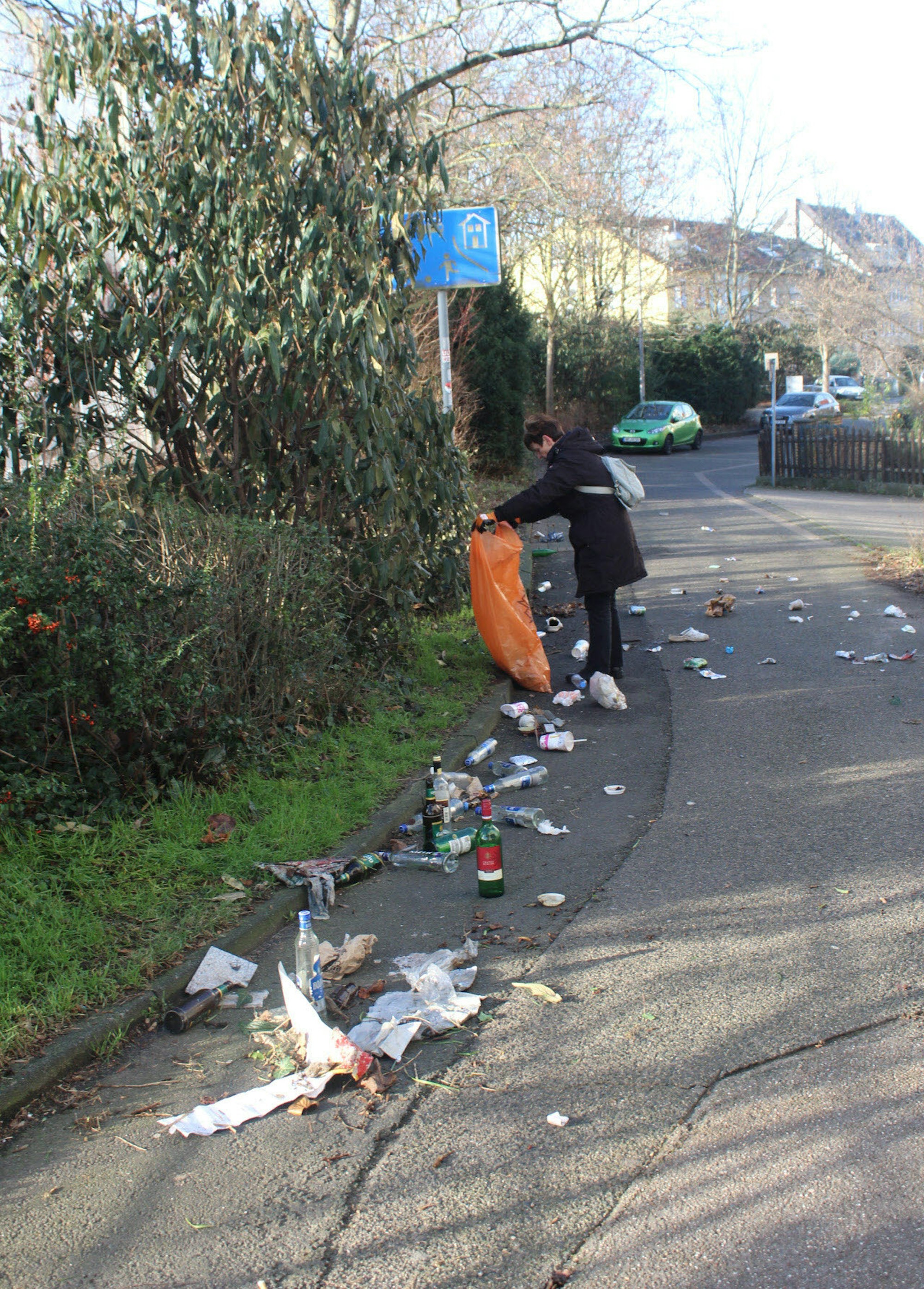Niehl – Zentnerweise Müll, in mindestens 50 orangefarbene Säcke gepackt und am Randes des „Dorfplatzes“ am Ortseingang von Alt-Niehl demonstrativ zu einem großen Haufen aufgetürmt; im übrigen Viertel befanden sich noch weitere kleine Sammelpunkte. Dazu die üblichen sperrigen Einzel-Fundstücke – wie Autoreifen, Schirmständer, ausrangierte Küchengeräte oder einen ganzen Karton alter VHS-Videokassetten.