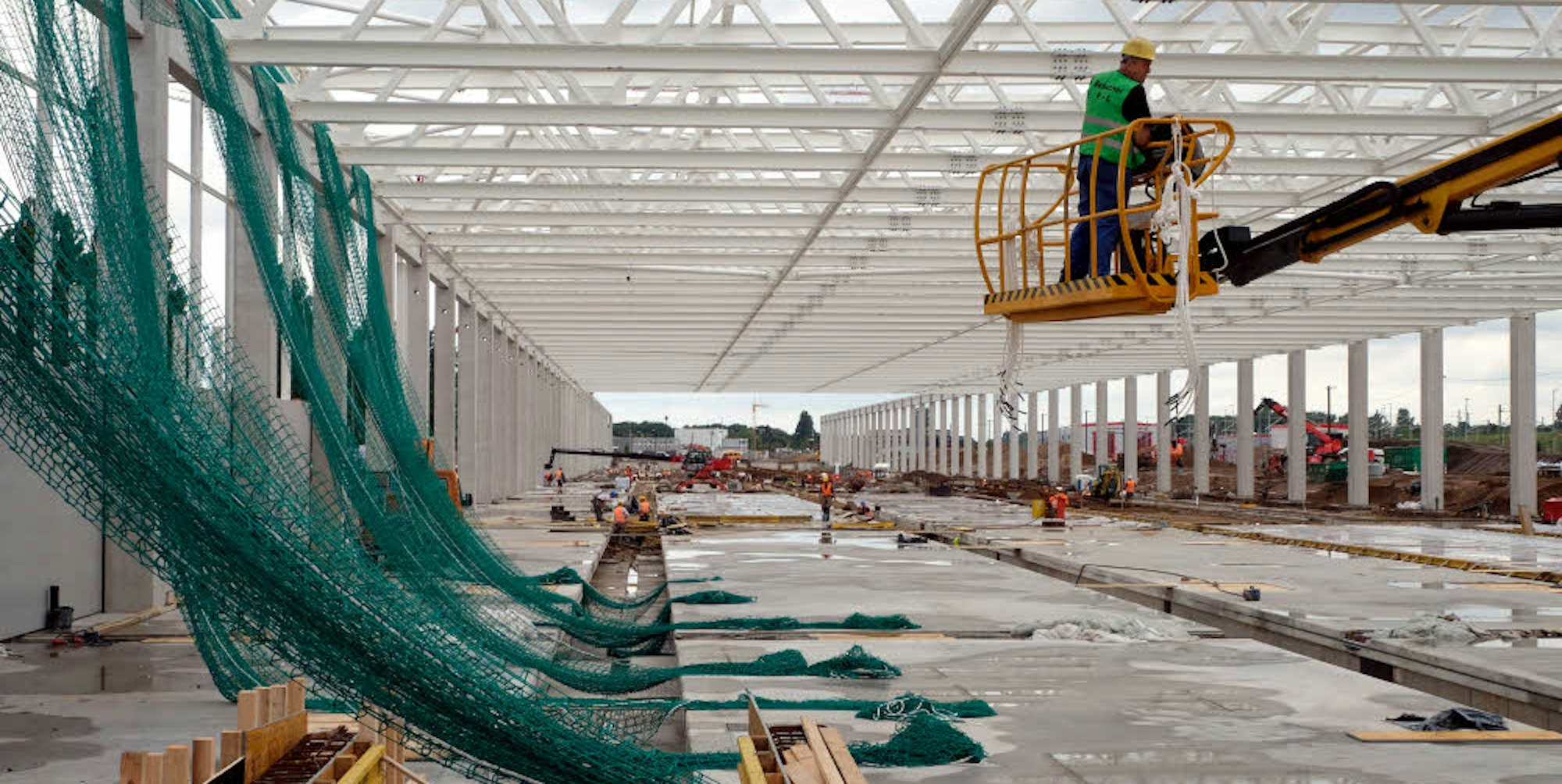 Der Bau macht Fortschritte. 1300 Bohrpfähle für eine sichere Statik der 445 Meter langen Werkhalle wurden in den sandigen Untergrund getrieben. Von den 90 Dachbindern, die später das Hallendach tragen werden, sind 34 montiert, ein jeder von ihnen zehn Meter lang und 90 Tonnen schwer. 4,5 der 20 Kilometer Gleise sind auch schon verlegt, 14 von 45 Weichen eingebaut, die ersten Oberleitungsmasten gesetzt. Drei Bombenfunde 2015 haben die Baustelle zwar beeinträchtigt, „dennoch liegen wir voll im Zeitplan“.