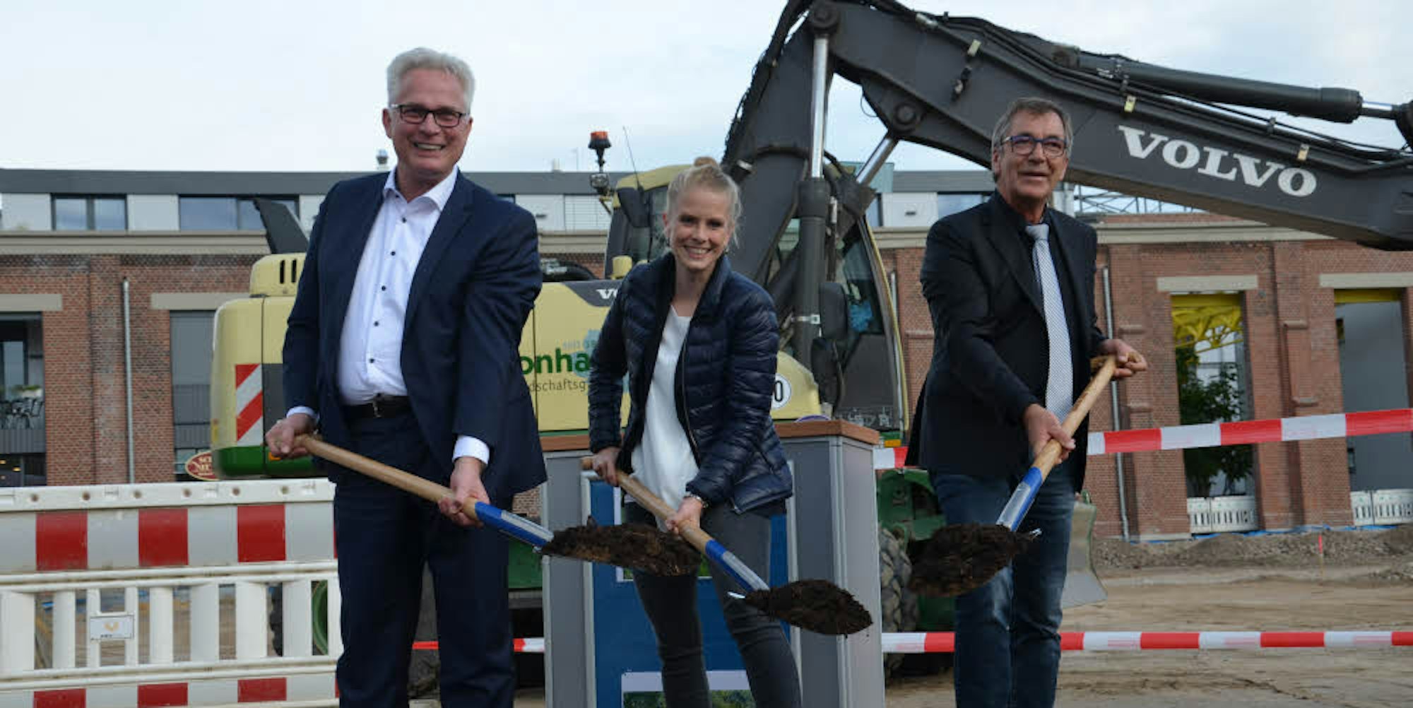 Andreas Röhrig, Susanne Gombert und Bernd Schößler (v.l.) beim Spatenstich für die neue Mitte des Clouth Quartiers.
