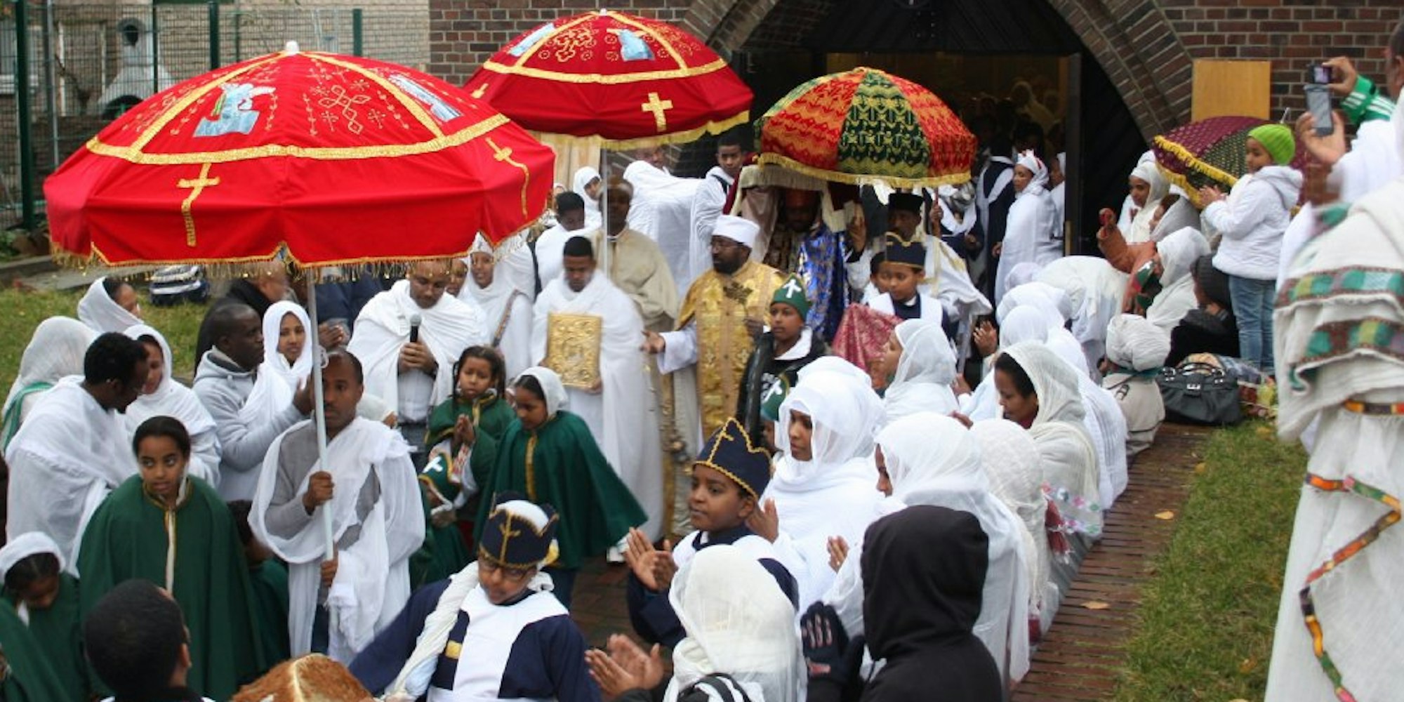Longerich – Das metallische Klappern der „Tsanatsel“, einer Handrassel, und Trommelschläge der „Kebero“ erklingen über den Kirchenvorplatz von Sankt Mikael. Mit einem melodischen Gesang ehren die in weiße Leinenkleidung gehüllten Gläubigen den Namenspatron ihrer Kirche, den Erzengel Michael, dem zu Ehren sie ein Fest veranstalten. Fröhlich mit den traditionellen äthiopischen Instrumenten musizierend ziehen sie in einer farbenfrohen Prozession aus dem Gotteshaus am Lindweilerweg. Dabei tragen die Gemeindemitglieder einen Tabot, eine Nachbildung der israelitischen Bundeslade, ein goldumschlagenes Evangelium, ein goldenes, reich verziertes Festkreuz und Bilder der Mutter Gottes sowie des Erzengels Michael. Die Stimmung ist sehr feierlich und gleichzeitig beschwingt.