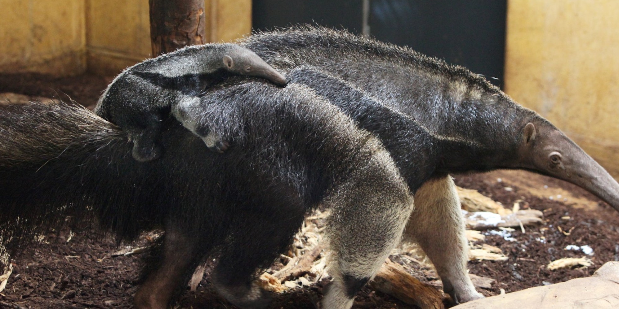 Bequem lässt sich der kleine Große Ameisenbär im Kölner Zoo von Muttertier Guapa durch das Gehege tragen.