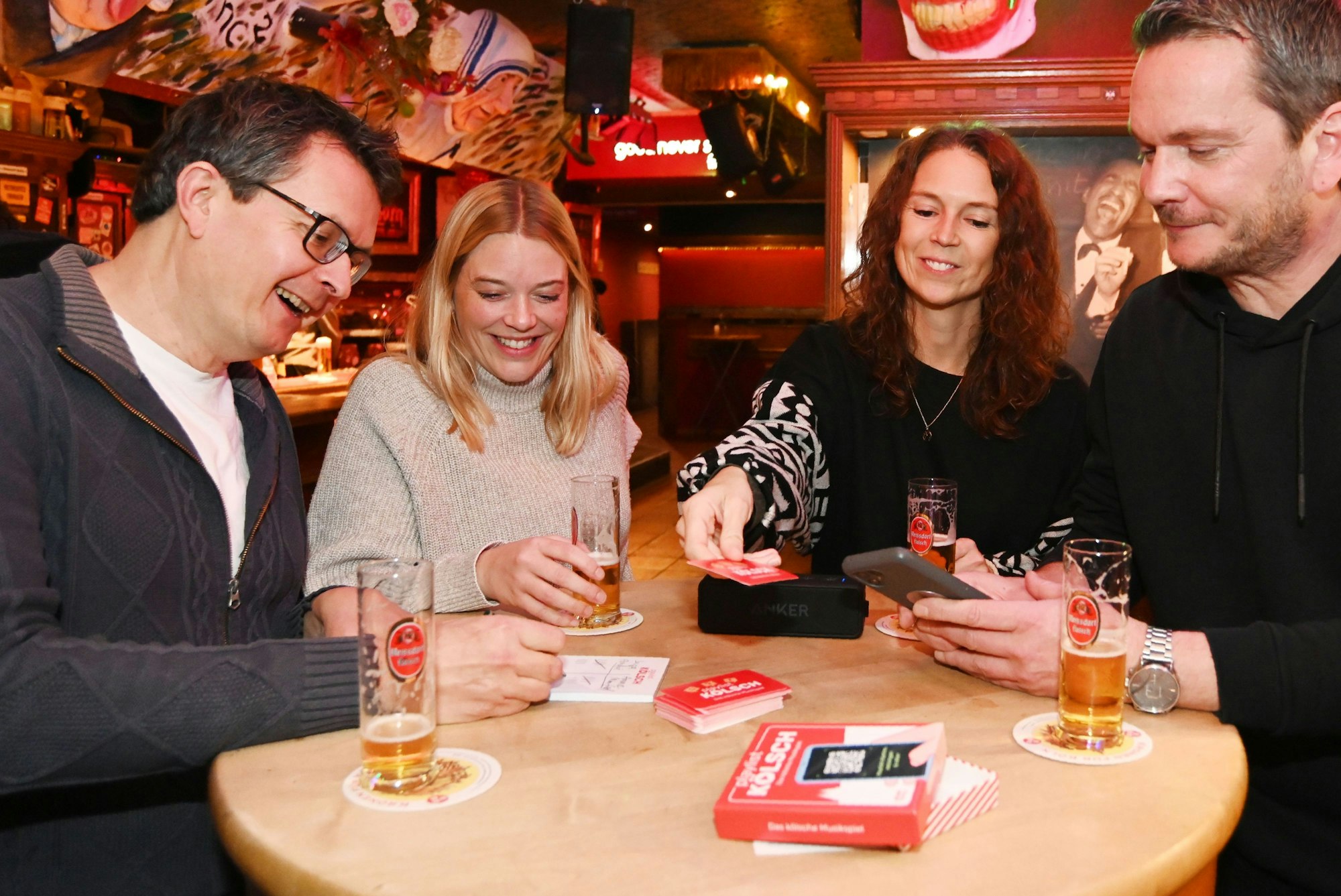 Der Kölner Spielemacher und Musikfachmann Manfred Söntgen (links) testet im Freundeskreis in der Kneipe Torburg das neue Musikspiel „Playlist Kölsch“.