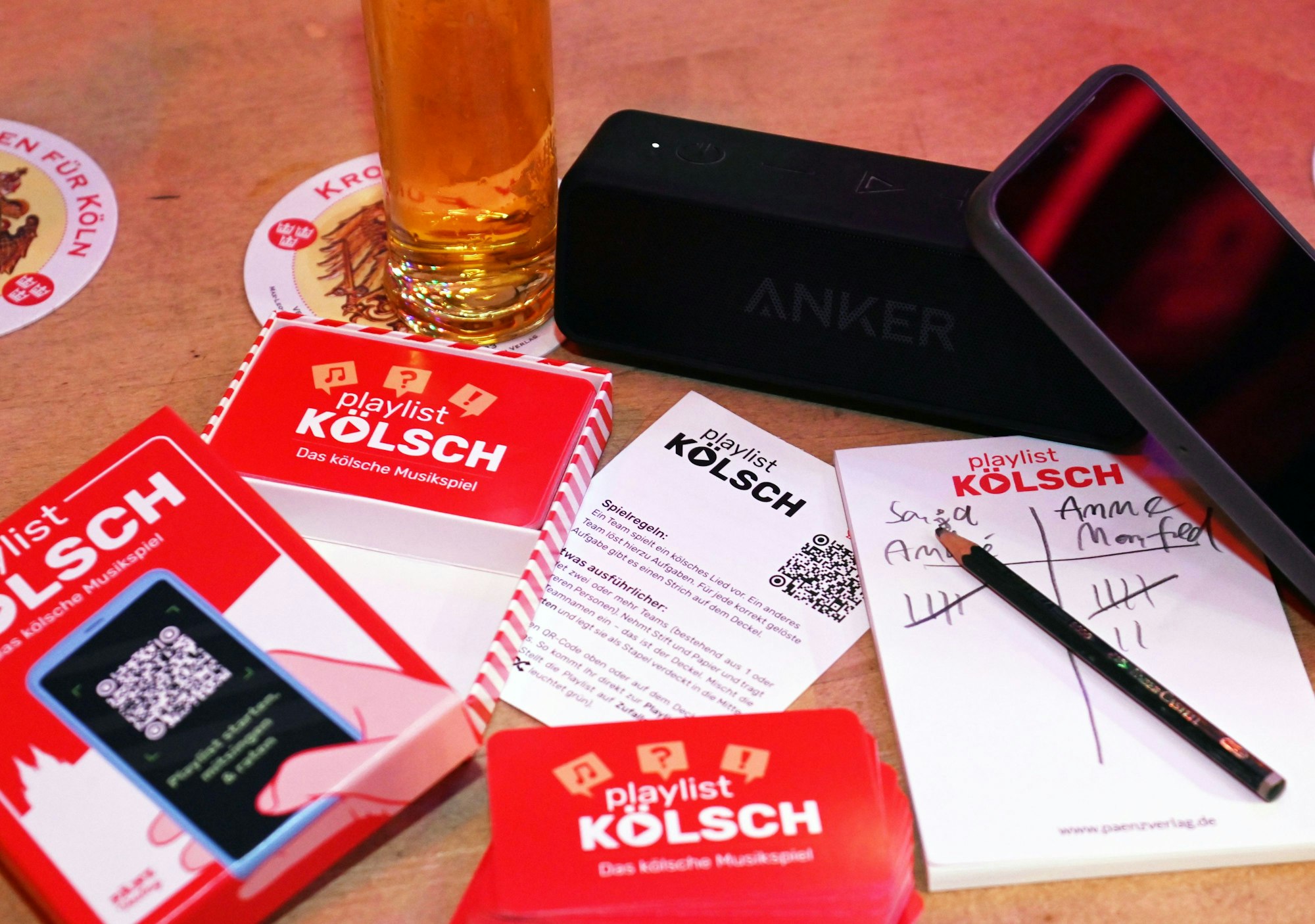 Die Spielregeln von „Playlist Kölsch“ unterscheiden sich ein wenig vom internationalen Erfolgsspiel. Die Kölner Variante arbeitet nicht wie Hitstar mit QR-Codes, die zu bestimmten Liedern führen. Da ist die kölsche Variante etwas unaufwändiger. Aber die spielentscheidende Idee, ein Set mit Fragen- und Aufgabenkarten mit dem Anhören von Musik zu verbinden, sorgt auch bei „Playlist Kölsch“ für großen Spaß. Das macht auch beim Kölner Musikspiel die Verbindung zum Streaming-Anbieter Spotify möglich. Söntgen hat drei Listen mit hunderten kölschen Liedern von Willi Ostermann bis Cat Ballou zusammengestellt. Ein Team am Tisch wählt einen Titel von der Spotify-Playlist aus und spielt ihn an. Die anderen müssen Titel und Künstler raten, Schätzfragen lösen und Wissensfragen zu Liedern und Bands der kölschen Szene beantworten.