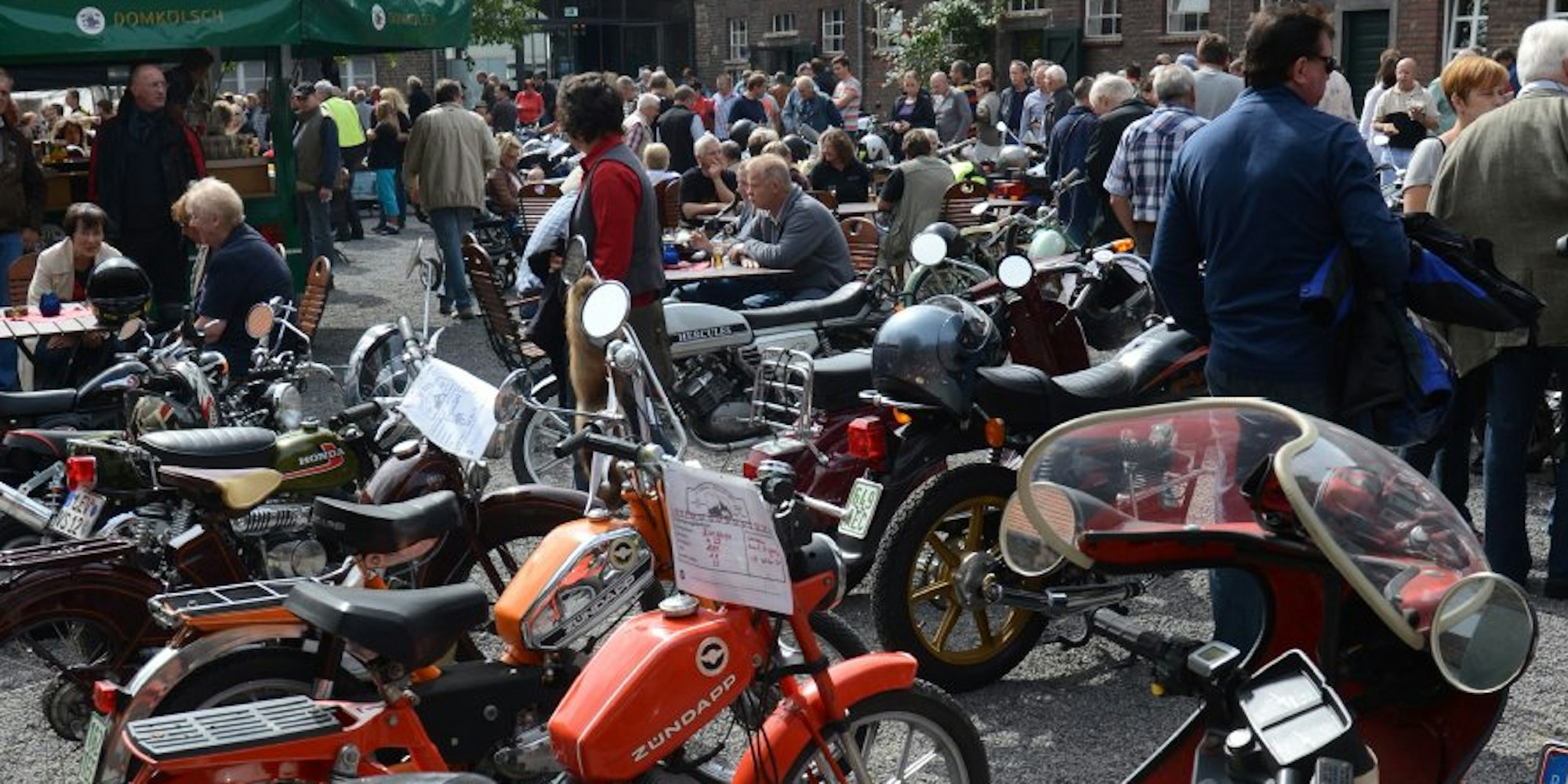 Das Oldtimer-Mopedtreffen im Eltzhof hat sich mit den Jahren zum Mekka für Liebhaber alter Mopeds aus ganz Deutschland entwickelt. Fast 300 von ihnen waren auch dieses Mal auf Einladung von Klaus Becker zum Eltzhof gekommen. „Eigentlich ist hier mittlerweile zu wenig Platz“, sagt er. „Im Innenhof haben wir die Mopeds und im Hinterhof den Teilemarkt.“ Im Vorraum des Veranstaltungs-Saales hat Becker auch wieder Platz für die Zündapp-Ausstellung gemacht.