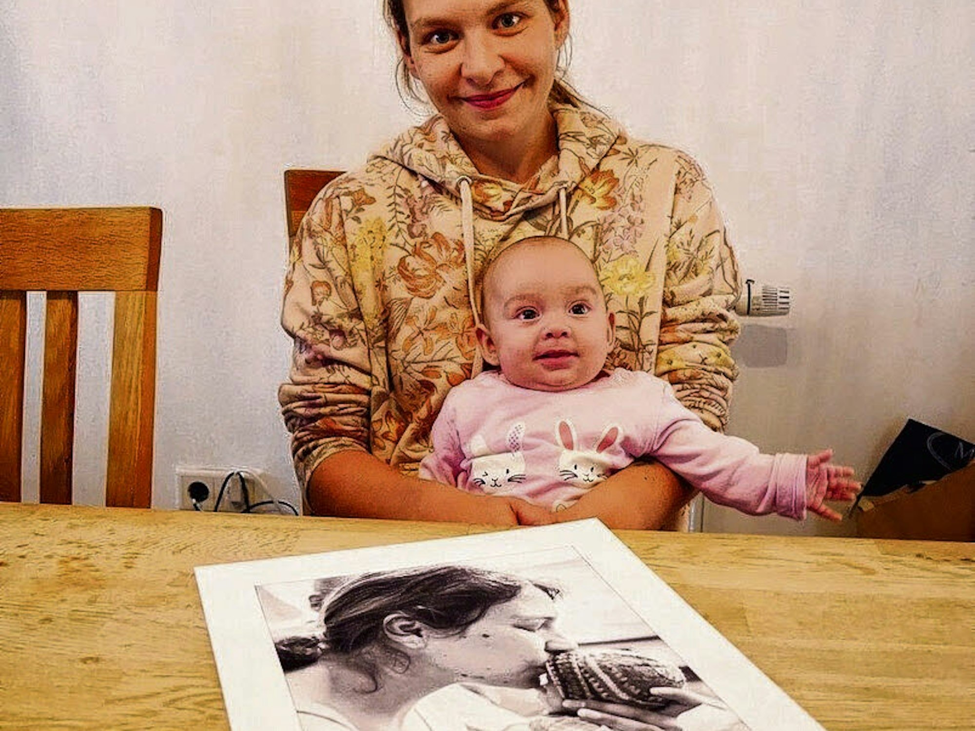 Renate Moser und Tochter Emily mit einem Foto des kleinen Elian (l.). Die Fotos von Elian hat Fotografin Katrin Moser zu einer Collage verarbeitet.