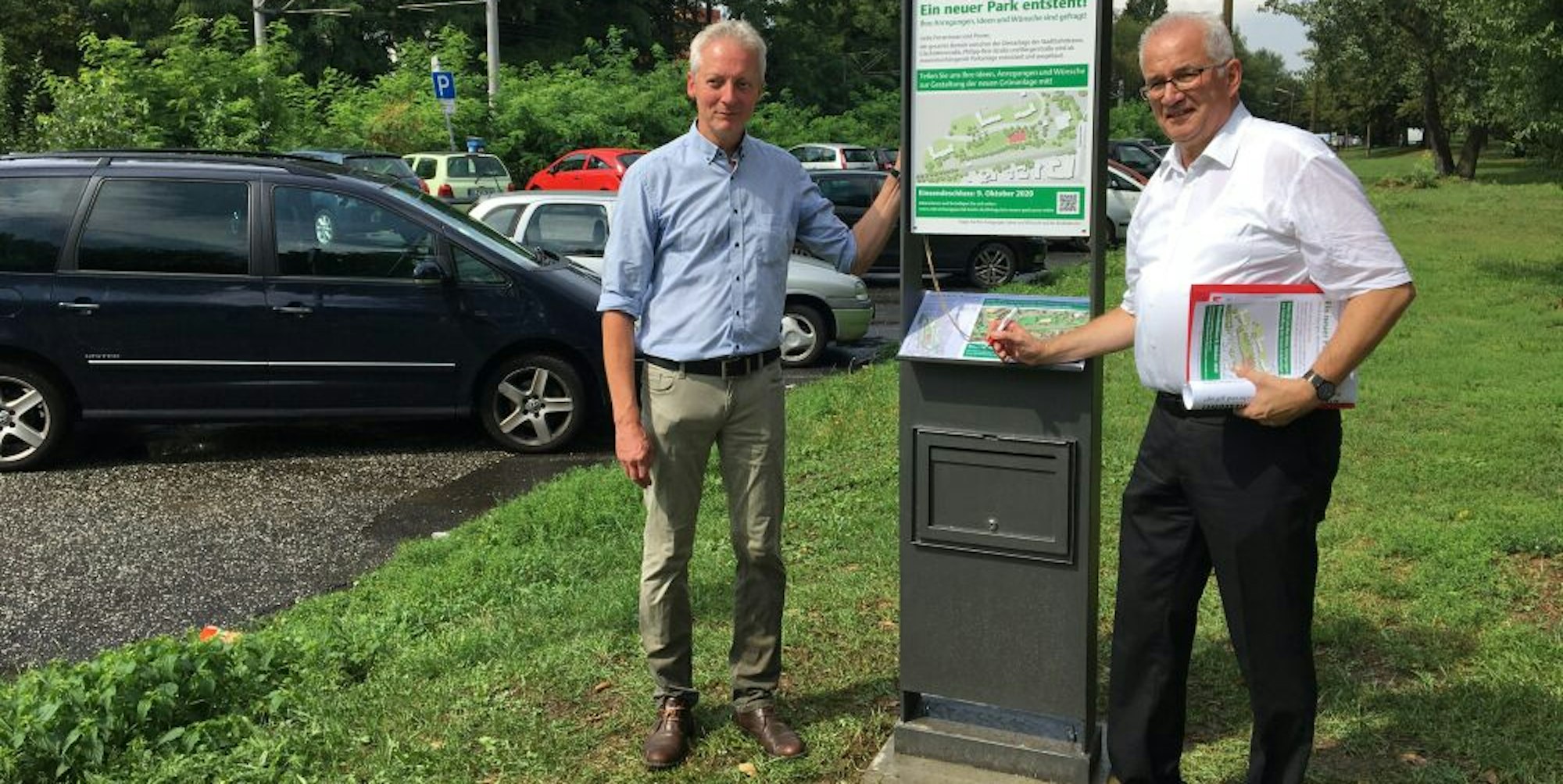 Joachim Bauer (l.) und Karl-Heinz-Merfeld am Wunsch-Briefkasten für den künftigen Park. Ein zweieinhalb Hektar großes unattraktives Areal soll zu einem vielfältigen Erholungsort umgestaltet werden.