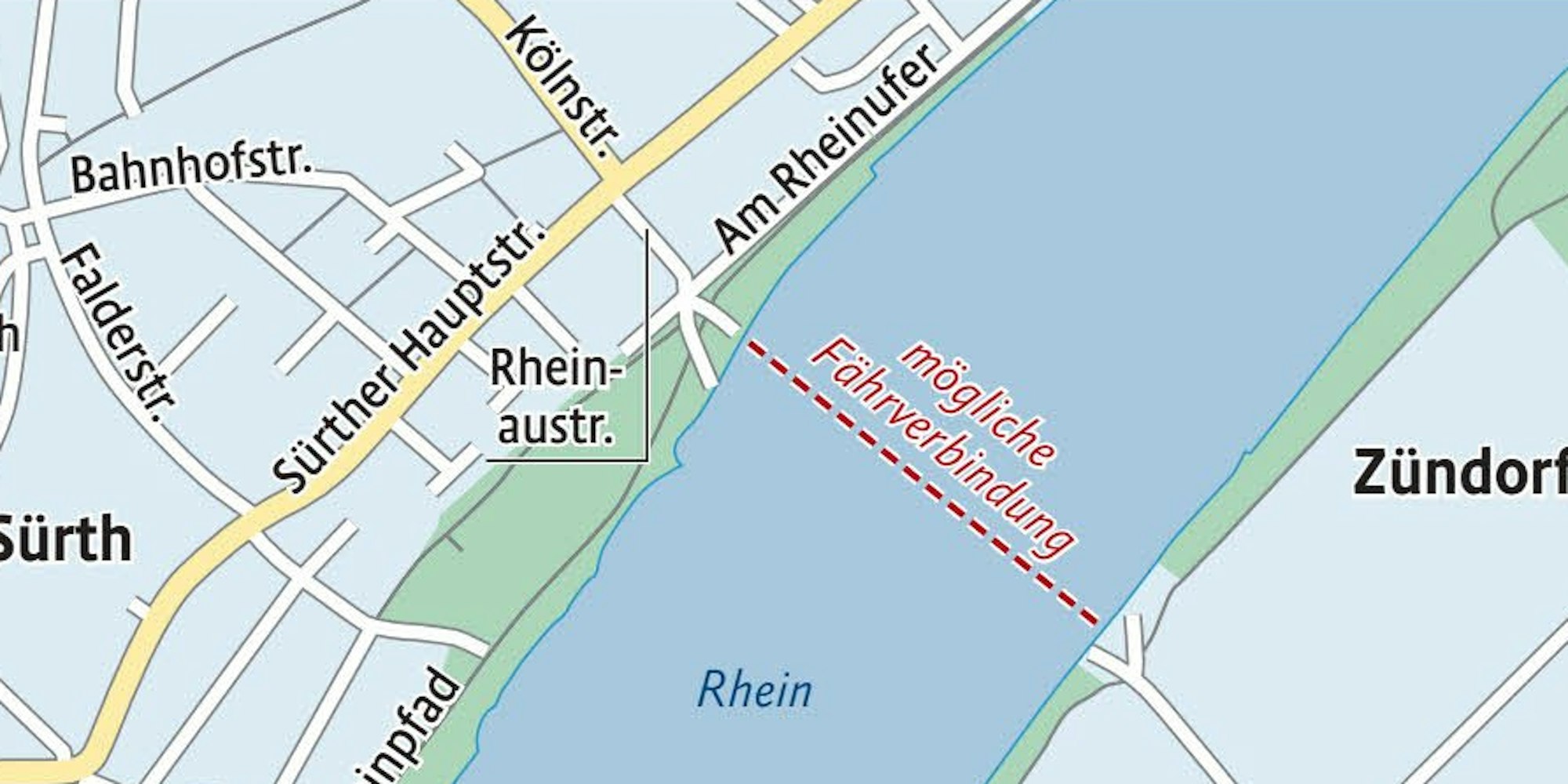 An der diskutierten Stelle sei das seiner Meinung nach wegen der Sürther Infrastruktur nicht möglich. Eine Fährverbindung könne er sich höchstens weiter südlich zwischen dem Strandbad Marie an der Frongasse in Porz-Langel und der gegenüberliegenden Fläche vorstellen, wo die Godorfer Hafenerweiterung geplant ist. Dort gebe es wenig Wohnbebauung, dafür allerdings geschützte Überflutungsflächen.