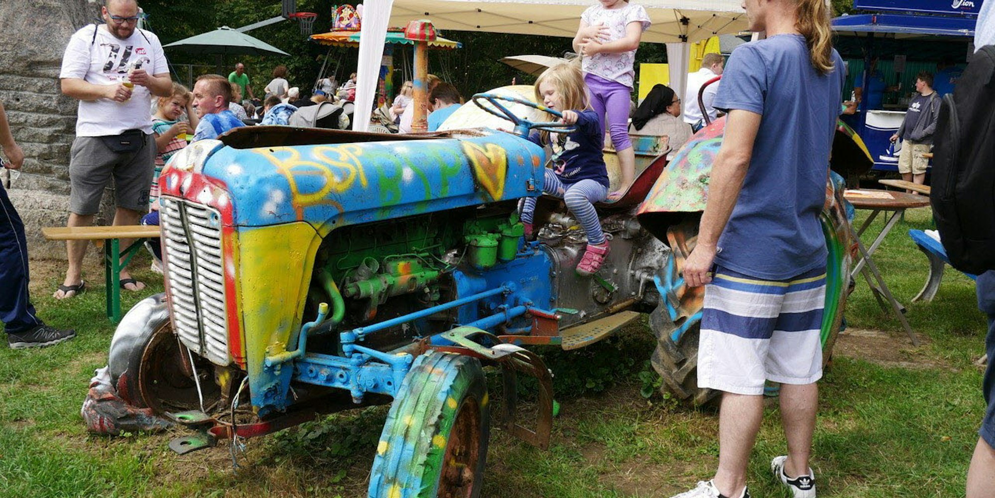 Da muss man einfach mal aufsteigen: Die kleinen Besucher auf dem bunt bemalten Trecker