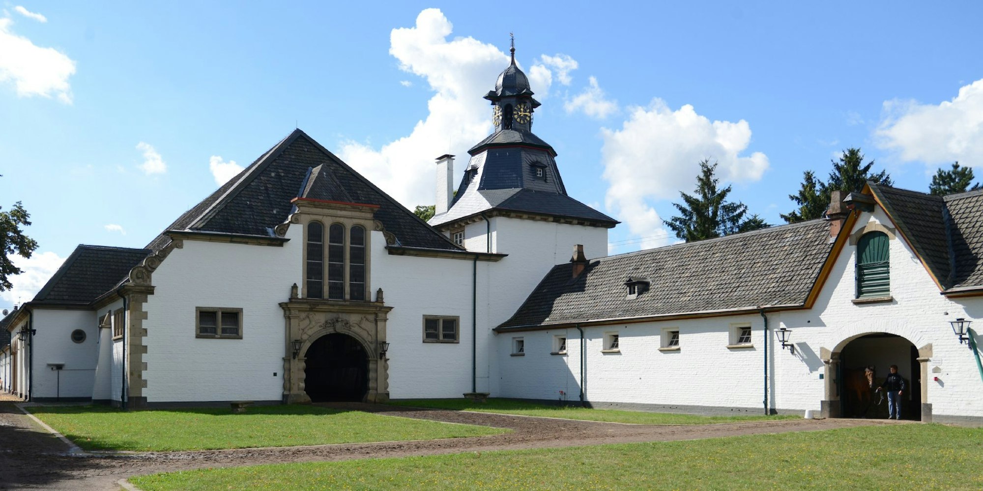 Das Gestüt Röttgen: Die komfortable Unterkunft für wertvolle Rennpferde gleicht einem Gutshof. Rechts befinden sich die Ställe für Hengste, im linken Teil des Gebäudes ist die Reithalle untergebracht.