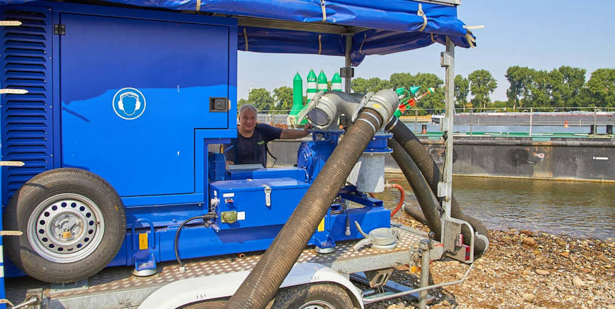 Dafür musste jeweils eine tonnenschwere Dieselpumpe am Rheinufer aufgestellt werden. Gut 250 Meter Schlauch sind dann von der Pumpe bis zum Fischweiher verlegt worden. Bis zu 20 Meter lang sind die einzelnen Schlauchelemente, die ausgerollt und zusammengefügt werden müssen.